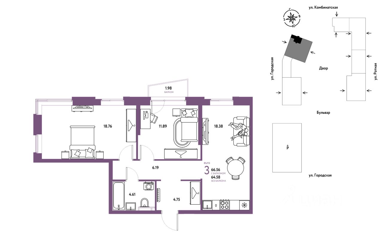3комнатная квартира площадью 66,56кв. м. на 20 этаже жилого комплекса ''Уральский сад''.