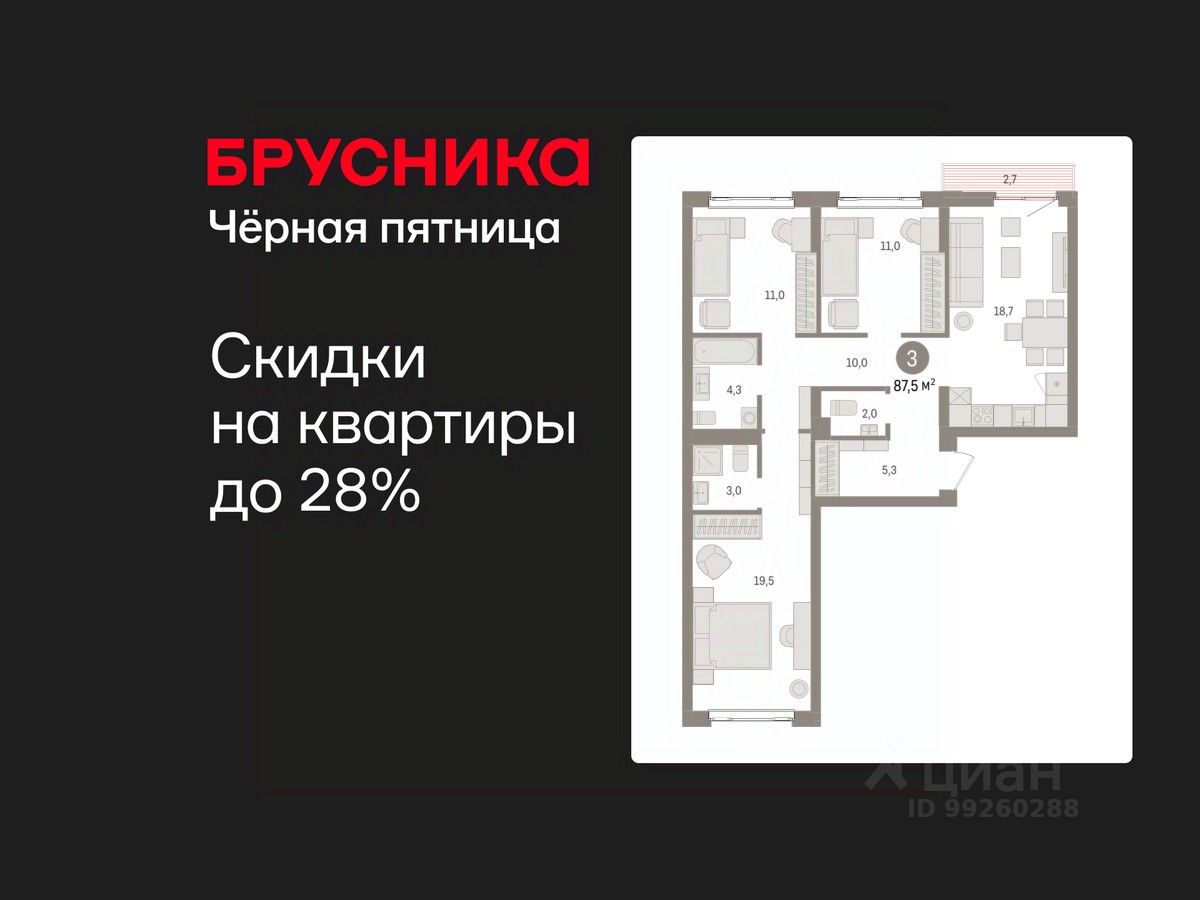 Продается 3-комн. квартира с предчистовой отделкой в ЖК ''Квартал Траектория'' на 4 этаже. Общая площадь: 87.5 кв.м., жилая: 41.5 кв.м., площадь просторной кухни-столовой: 18.7 кв.м. Квартира - распашонка, без проходных комнат, окна выходят на paзные стороны дома. В квартире один балкон, два совмещенных санузла. Высота потолков 2.82 м.