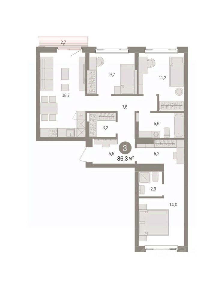 Квартира с кухней-гостиной и тремя спальнями в квартале ''Траектория''. Особенности планировки: окна на две стороны, гардеробная, вид во двор, разнесённые спальни, предчистовая отделка, мастер-спальня, балкон. квартиры в нашей базе: МНВ01-Ж7.4.7.