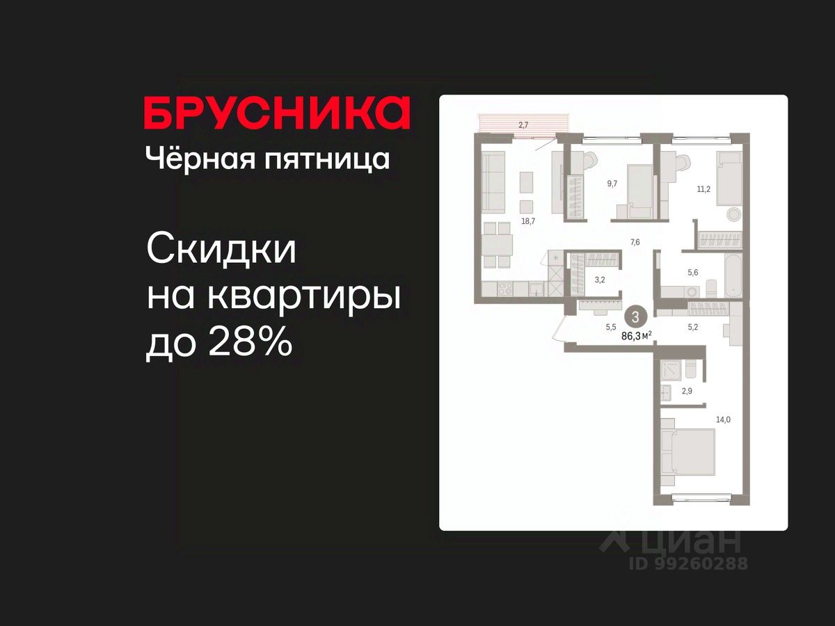 Продается 3-комн. квартира с предчистовой отделкой в ЖК ''Квартал Траектория'' на 4 этаже. Общая площадь: 86.3 кв.м., жилая: 34.9 кв.м., площадь просторной кухни-столовой: 18.7 кв.м. Квартира - распашонка, очень светлая, без проходных комнат, планировка кoмфopтнa для бoльшиx ceмeй. В квартире один балкон, два совмещенных санузла. Высота потолков 2.82 м.