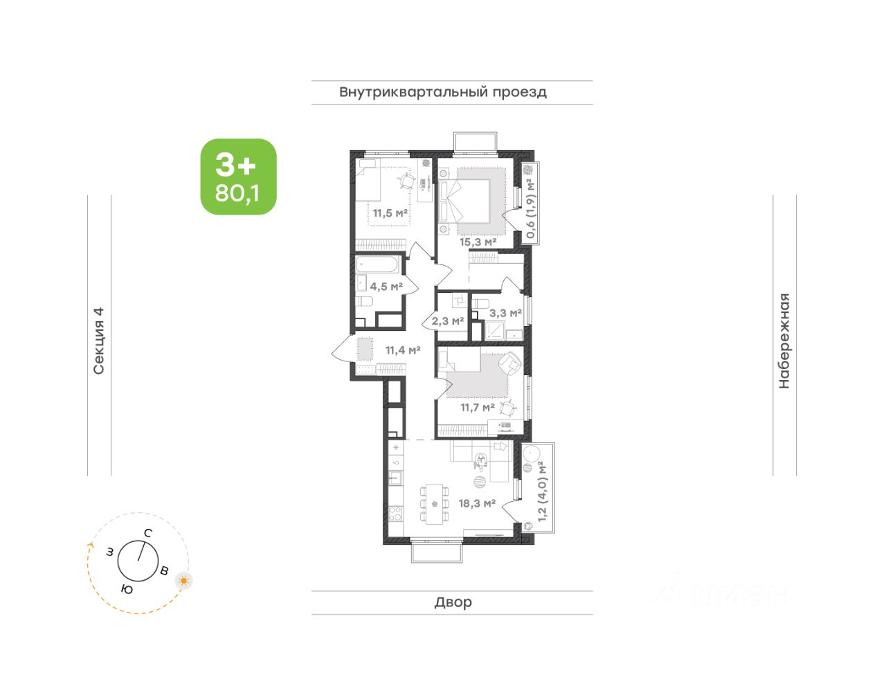 Просторная, светлая квартира, где каждый член семьи найдёт себе место Мастер-спальня — уединённое пространство с личным санузлом, удобным местом для хранения и выходом на французский балкон. Здесь можно просыпаться с видом на реку, наслаждаясь утренним светом и свежим воздухом Кухня-гостиная — центр квартиры, где удобно собираться всей семьёй по вечерам, устраивать ужины и тёплые посиделки с друзьями. Открытое пространство создаёт ощущение свободы и лёгкости Две спальни подойдут для детей, гостей или рабочего кабинета. Светлые, просторные и уютные — они легко адаптируются под любые задачи Прихожая — вместительная и продуманная.