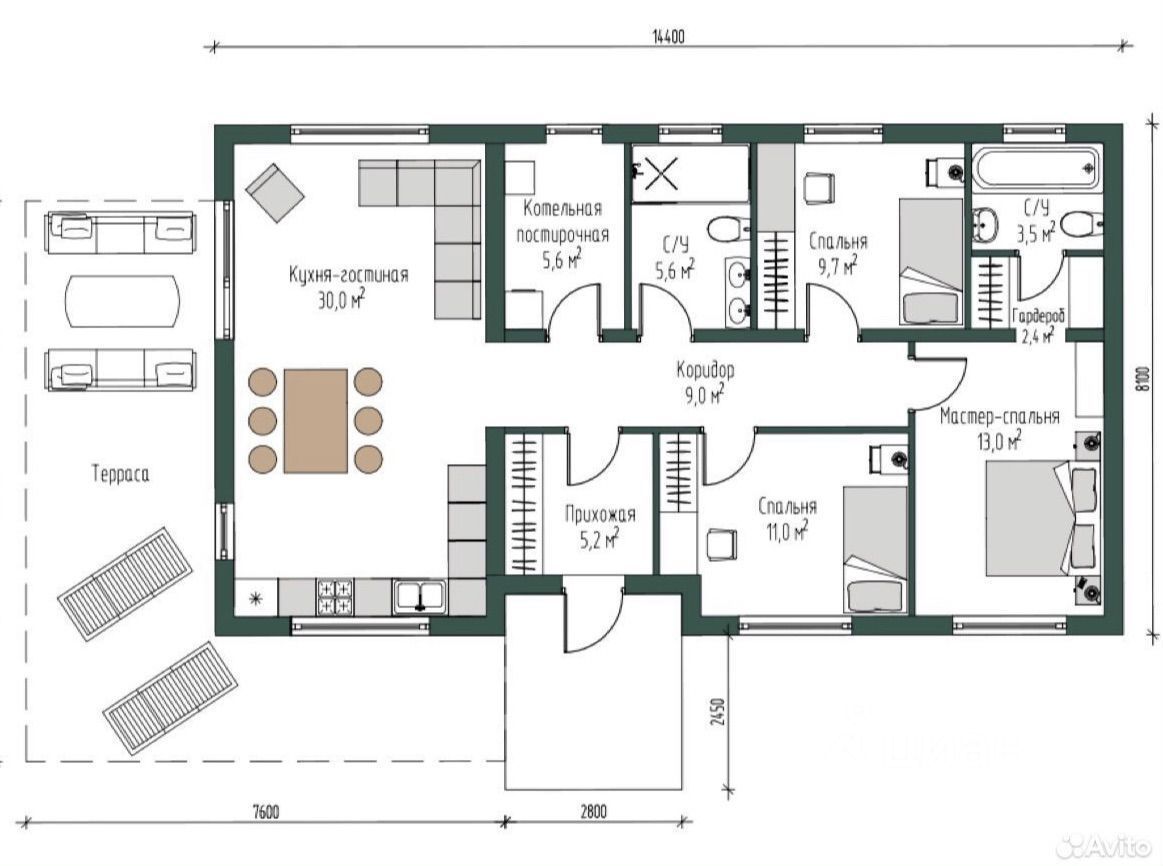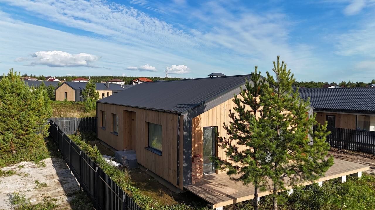 • Общая площадь: 100 м² + терраса 40 м² • 3 спальни (включая мастер-спальню с гардеробной и санузлом) • Кухня-гостиная с панорамными окнами, теплый контур на откосах • 2 санузла • Просторная терраса 40 м² • Фасад: дерево + декоративная штукатурка