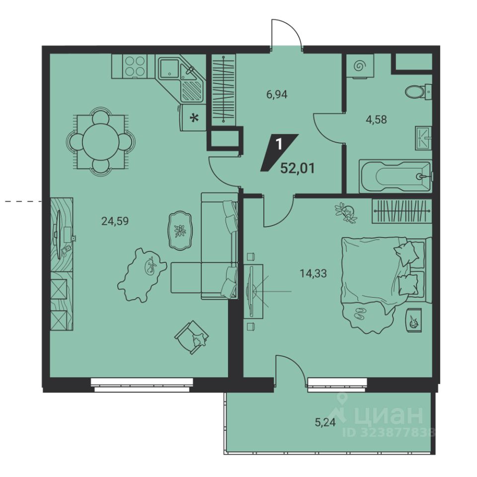 Общая площадь51,5 м2