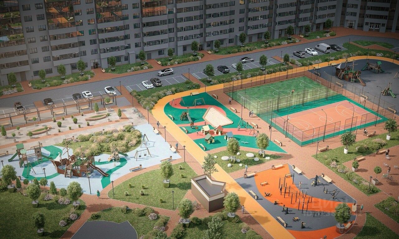 Одна из главных особенностей проекта двор в 2,8 Га, который по размеру сопоставим с четырьмя футбольными полями. Жители дома могут объединяться и проводить спортивные турниры по футболу, волейболу или баскетболу для этого есть два оборудованных корта. Для тех, кто предпочитает другие виды тренировок, организовано воркаут-пространство.