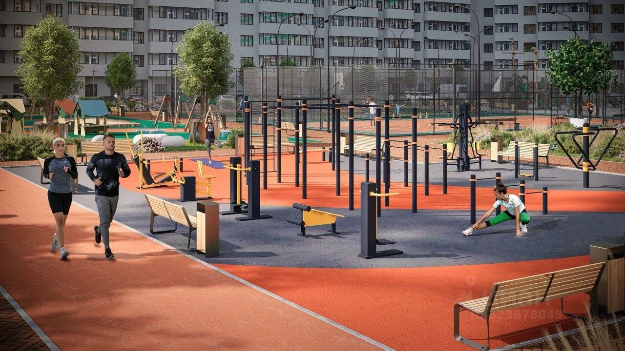 Одна из главных особенностей проекта двор в 2,8 Га, который по размеру сопоставим с четырьмя футбольными полями. Жители дома могут объединяться и проводить спортивные турниры по футболу, волейболу или баскетболу для этого есть два оборудованных корта. Для тех, кто предпочитает другие виды тренировок, организовано воркаут-пространство.