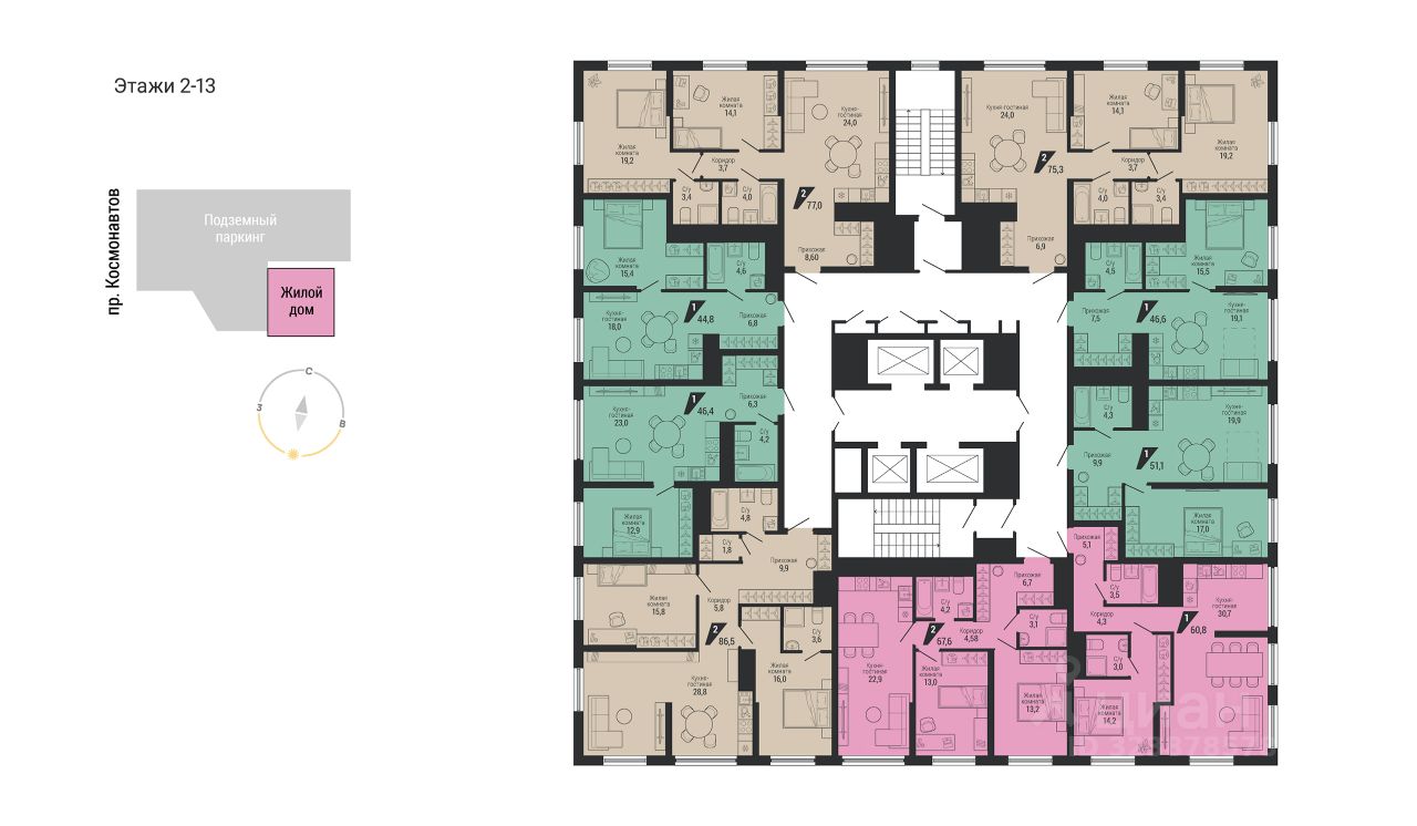 Планировки начинаются от 44,8 м² и доходят до 159,5 м². На каждом этаже располагается от восьми квартир классического и евроформата от двух до пяти комнат. Застройщик предлагает два вида отделки: white box и чистовую. Есть возможность перепланировки.
