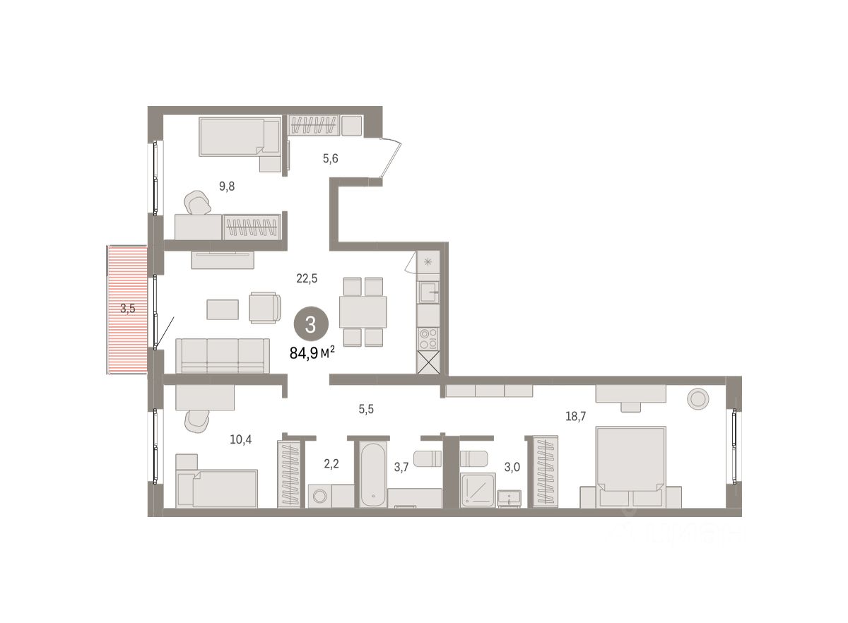 Квартира с кухней-гостиной и тремя спальнями в Южных кварталах. Особенности планировки: окна на две стороны, разнесённые спальни, предчистовая отделка, мастер-спальня, постирочная, балкон. квартиры в нашей базе: ЮКВ08-Ж4.4.6.