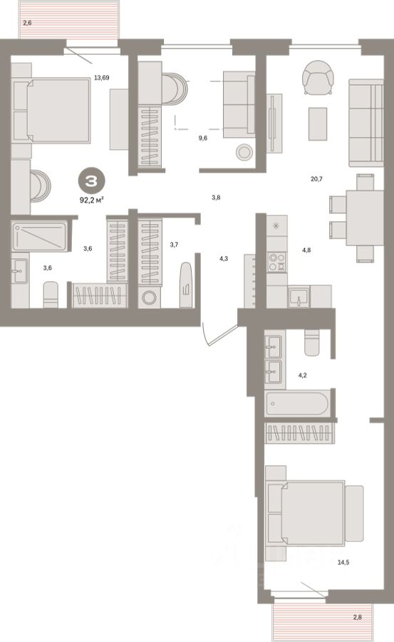 Квартира с кухней-гостиной и тремя спальнями в Южных кварталах. Особенности планировки: окна на две стороны, гардеробная, вид во двор, разнесённые спальни, предчистовая отделка, мастер-спальня, балкон. квартиры в нашей базе: ЮКВ11-Ж6.5.3.