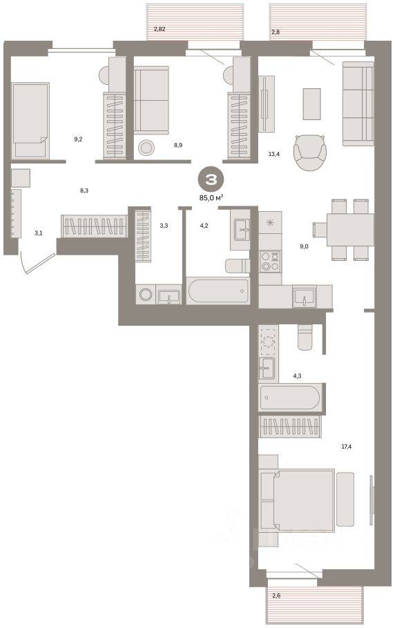 Квартира с кухней-гостиной и тремя спальнями в Южных кварталах. Особенности планировки: окна на две стороны, вид во двор, разнесённые спальни, предчистовая отделка, мастер-спальня, постирочная, балкон. квартиры в нашей базе: ЮКВ11-Ж4.3.1.