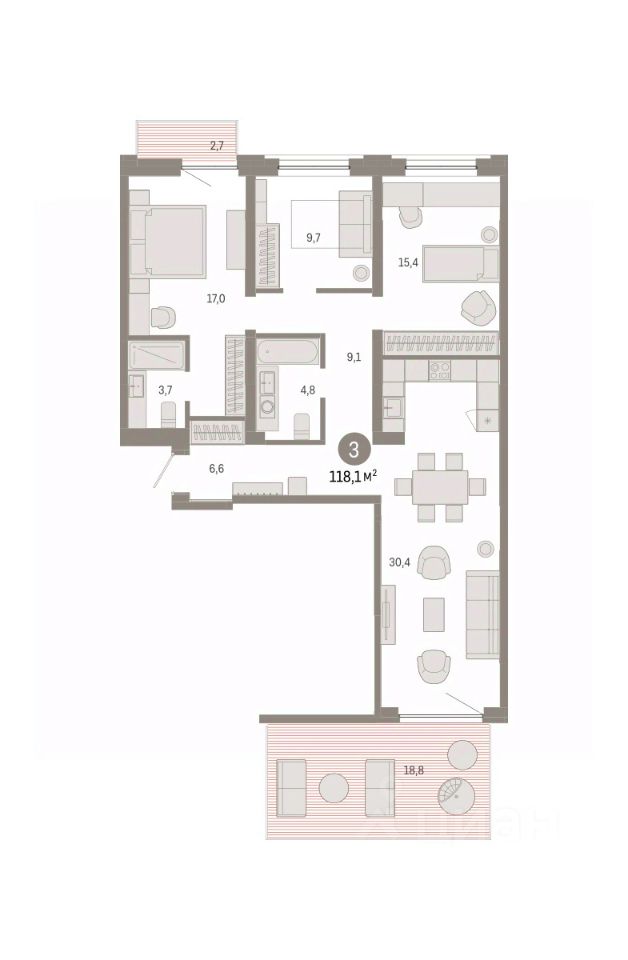Квартира с кухней-гостиной и тремя спальнями в Южных кварталах. Особенности планировки: окна на две стороны, рабочий кабинет, вид во двор, разнесённые спальни, предчистовая отделка, мастер-спальня, терраса, балкон. квартиры в нашей базе: ЮКВ11-Ж6.2.2.