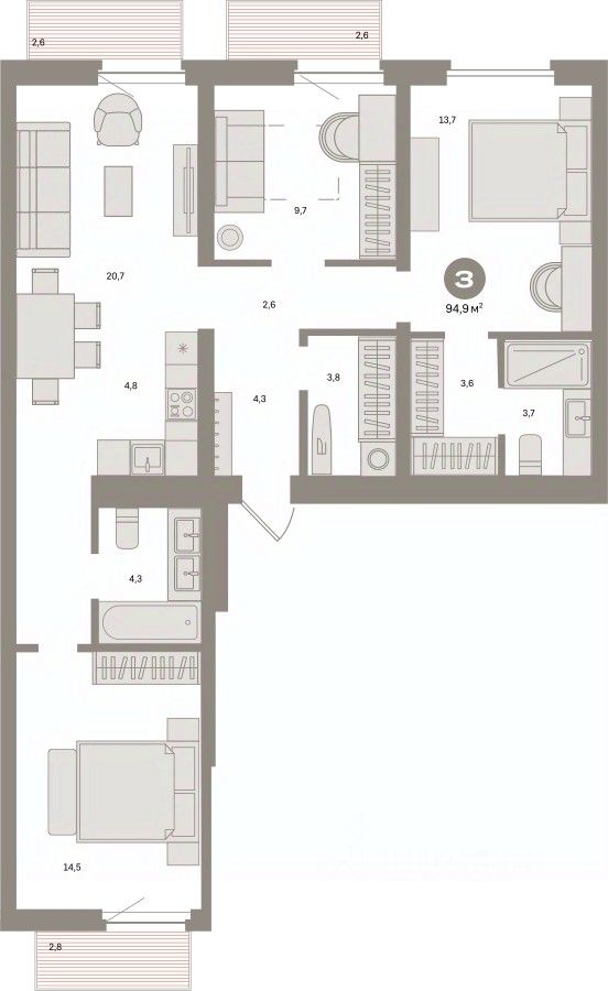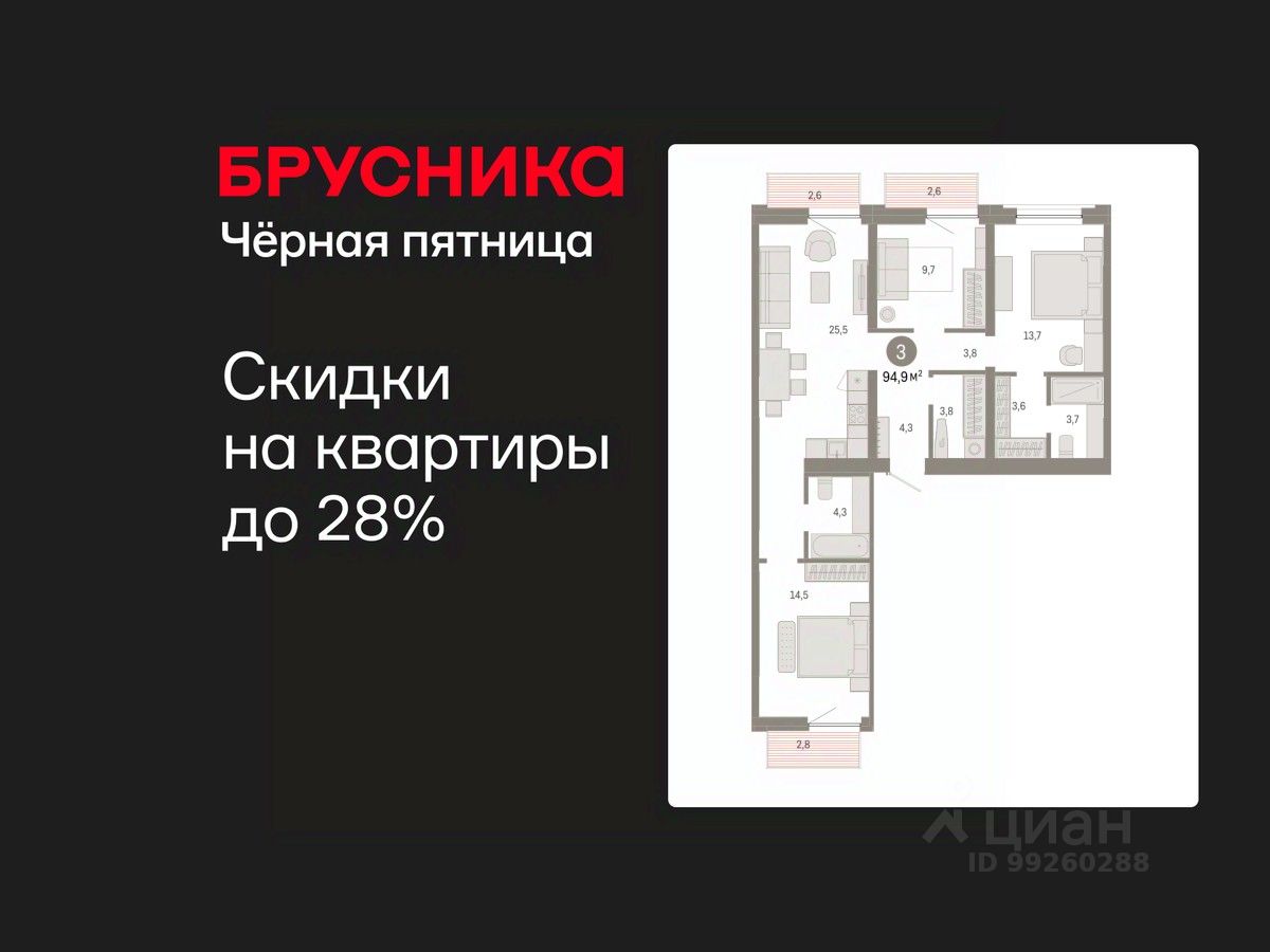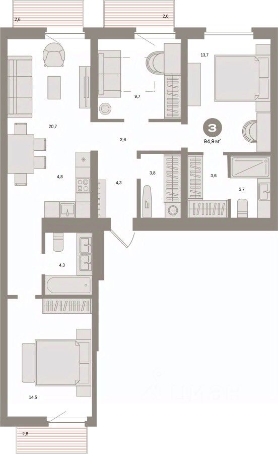 Квартира с кухней-гостиной и тремя спальнями в Южных кварталах. Особенности планировки: окна на две стороны, гардеробная, вид во двор, разнесённые спальни, предчистовая отделка, мастер-спальня, балкон. квартиры в нашей базе: ЮКВ11-Ж7.5.1.