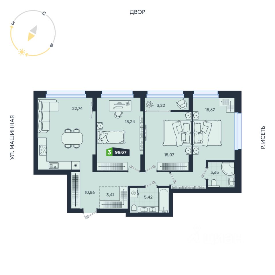 Продаётся 3-комнатная квартира в строящемся доме (Дом 8 (17А-17В)), срок сдачи: III кв. 2027, общей площадью 99.67 кв.м., на 7 этаже. В жилом квартале есть собственный выход в ЦПКиО им. Маяковского для утренних пробежек и отдыха всей семьёй.