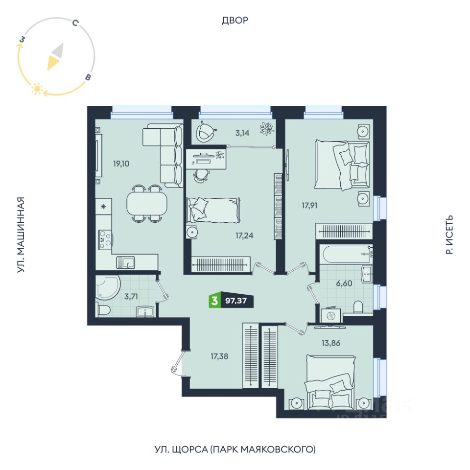 Продаётся 3-комнатная квартира в строящемся доме (Дом 8 (17А-17В)), срок сдачи: III кв. 2027, общей площадью 97.37 кв.м., на 29 этаже. В жилом квартале есть собственный выход в ЦПКиО им. Маяковского для утренних пробежек и отдыха всей семьёй.