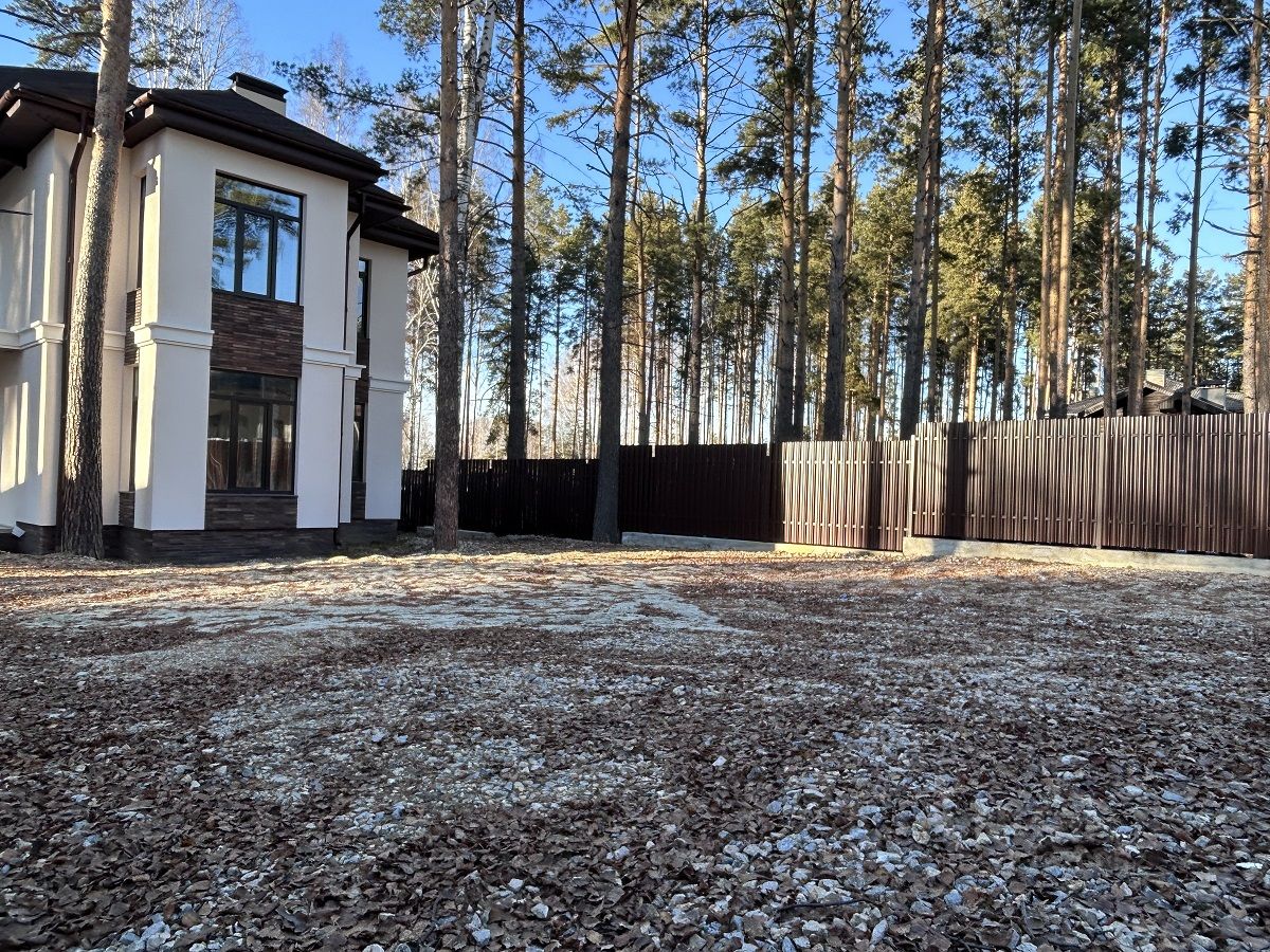 УЧАСТОК 9 соток. Огорожен забором - евро-штакетник на ленточном бетонном фундаменте. Откатные автоматические ворота. Калитка с выходом на прогулочную зону и детскую площадку. Сделана первичная подготовка под благоустройство участка. Перед участком сделана парковочная зона на 4 машины.