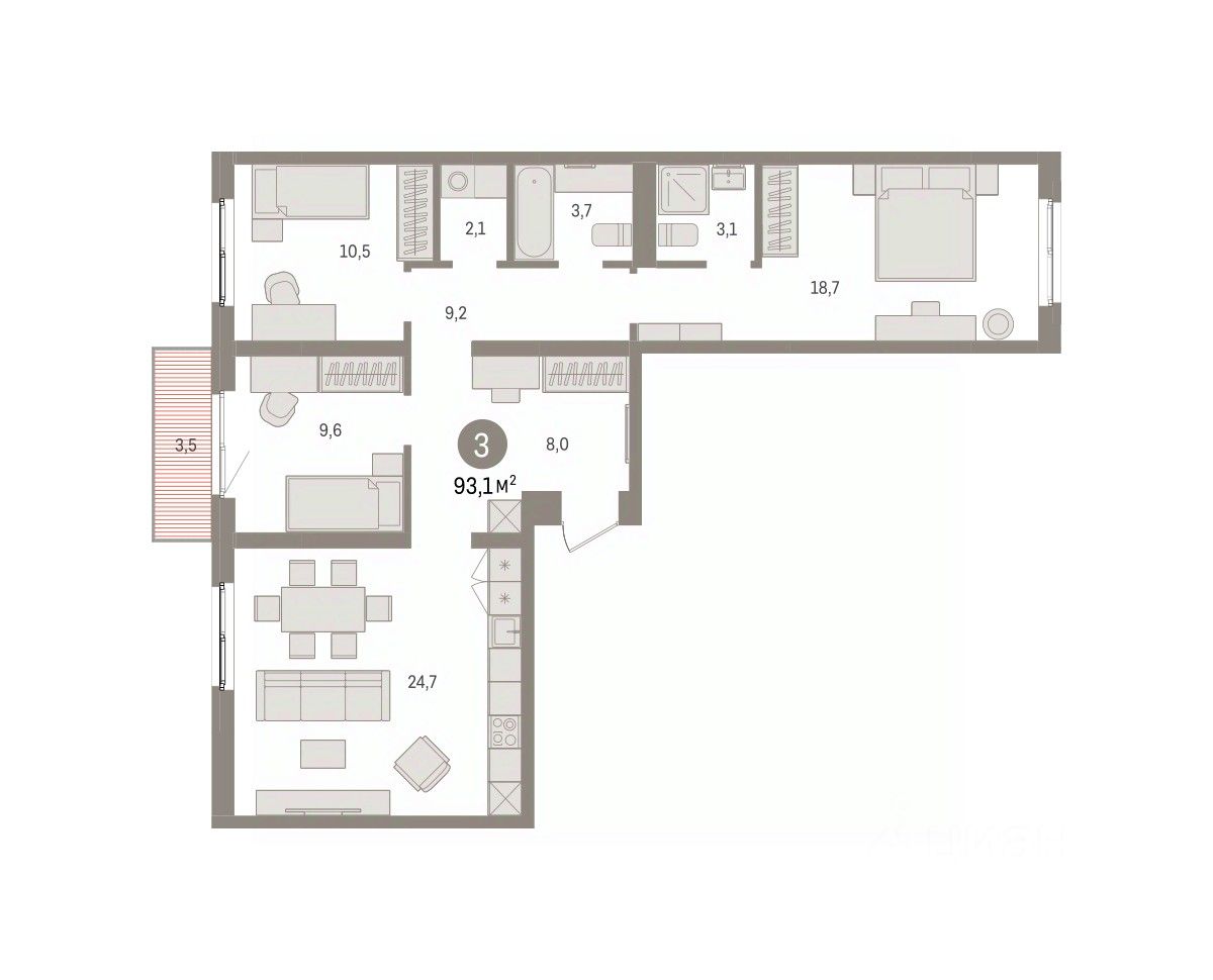 Квартира с кухней-гостиной и тремя спальнями в Южных кварталах. Особенности планировки: окна на две стороны, вид во двор, разнесённые спальни, предчистовая отделка, мастер-спальня, постирочная, балкон. квартиры в нашей базе: ЮКВ08-Ж5.4.1.