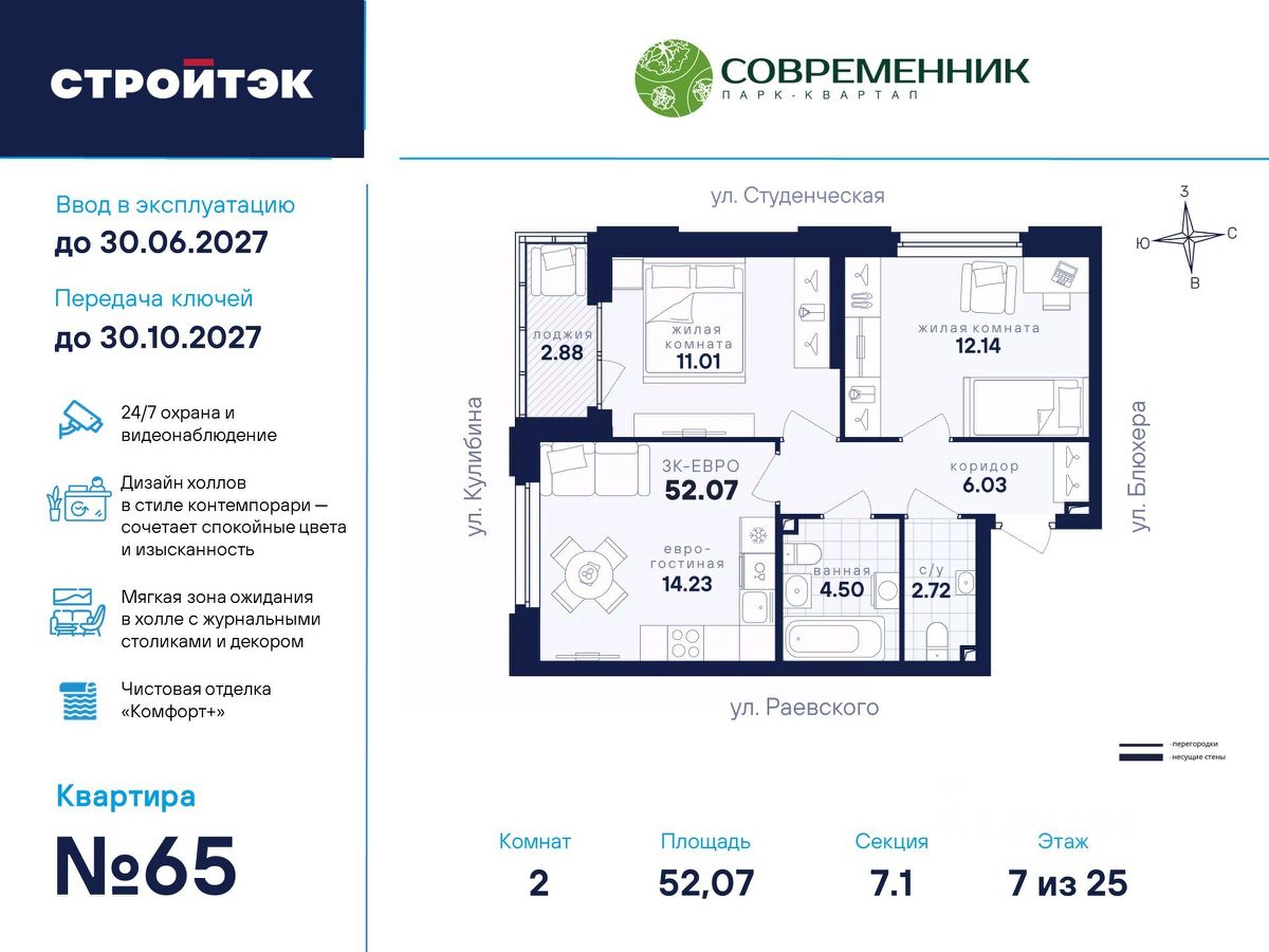 Время жить счастливо Современник — знаковый парк-квартал в интеллигентном районе Втузгородок, откуда недалеко до центра, а вблизи ведущие вузы и театры. Квартал состоит из 8 очередей строительства. Шесть очередей уже сданы и заселены, седьмая строится. В продаже квартиры от застройщика: 1 этап строящейся 7-й очереди. Объединяет квартал большой внутренний парк площадью в гектар — богатый прогулочными маршрутами, тенистыми деревьями, пространствами для отдыха, спорта и детских игр. С внешней стороны, у домов седьмой очереди, появится гостевой центр. Проект создавали в KCAP Architects and Planners, архитектурном бюро из Нидерландов, чьи работы украшают ландшафты Гамбурга, Роттердама, Антверпена и других городов Европы. Современные технологии, продуманное пространство и трендовый облик зданий создают размеренную и счастливую атмосферу для жизни здесь. Достойное окружение До проспекта Ленина на машине вы доберётесь за 10 минут, а с другой стороны, неподалёку — Шарташский лесопарк с озером Шарташ, которому около миллиона лет. Здесь для вас пляжи, лодочные станции, тропы для бега, спортивные площадки и кафе. В квартале уже работают супермаркеты, пекарни, салон красоты и не только. Ближние школы, гимназии и университеты помогут расправить крылья новым поколениям, а детские сады станут заботливой средой в начале пути. Кстати, на территории квартала спроектирован муниципальный детский сад на 200 мест. Выходите во двор Гуляйте по зелёным аллеям или устройтесь с книгой в гамаке. Займитесь воркаутом, футболом, баскетболом или пинг-понгом. Проводите семейные праздники под крытым амфитеатром или отправьте детей весело играть на насыщенный плейхаб. Мы всё предусмотрели. На закрытой территории без машин и посторонних спокойно и безопасно. Видеонаблюдение и освещение добавляют ещё больше уверенности. Впечатляющая доминанта у домов 7 очереди — новый гостевой центр: камерное пространство под навесом-перголой с озеленением и скамейками, чтобы встречать друзей или просто коротать вечер. Ваша зона комфорта Стильное лобби Современника мы выполним в эстетике contemporary: минимализм, сочетание дерева со штукатуркой и тёмным металлом, зеркала, витражи. Обстановка из мягкой мебели, растений и книг. Двери из холла выходят на обе стороны. Внутри — специальная комната для колясок и самокатов. На минус первом этаже подземный паркинг с 201 машино-местом, куда легко попасть на лифте прямо с вашего этажа. Здесь же можно приобрести одну из 67 кладовых, чтобы хранить сезонный инвентарь и крупную технику. СТРОЙТЭК возводит 7 очередь в 3 этапа. Дом с привилегиями Первый этап — секция 7.1, отдельная башня в 25 этажей. Здесь 246 квартир в 19 уникальных планировках от студий до 3-комнатных, в классических и евро-вариантах. Просторные кухни-гостиные, гардеробные и окна на 2 стороны — лишь часть их плюсов. В Современнике улучшенный стандарт отделки ''Комфорт +''. Помимо привычных комфортных сантехники и электрики, в него входят оконные стёкла Energy Light, которые помогают сохранять комфорт