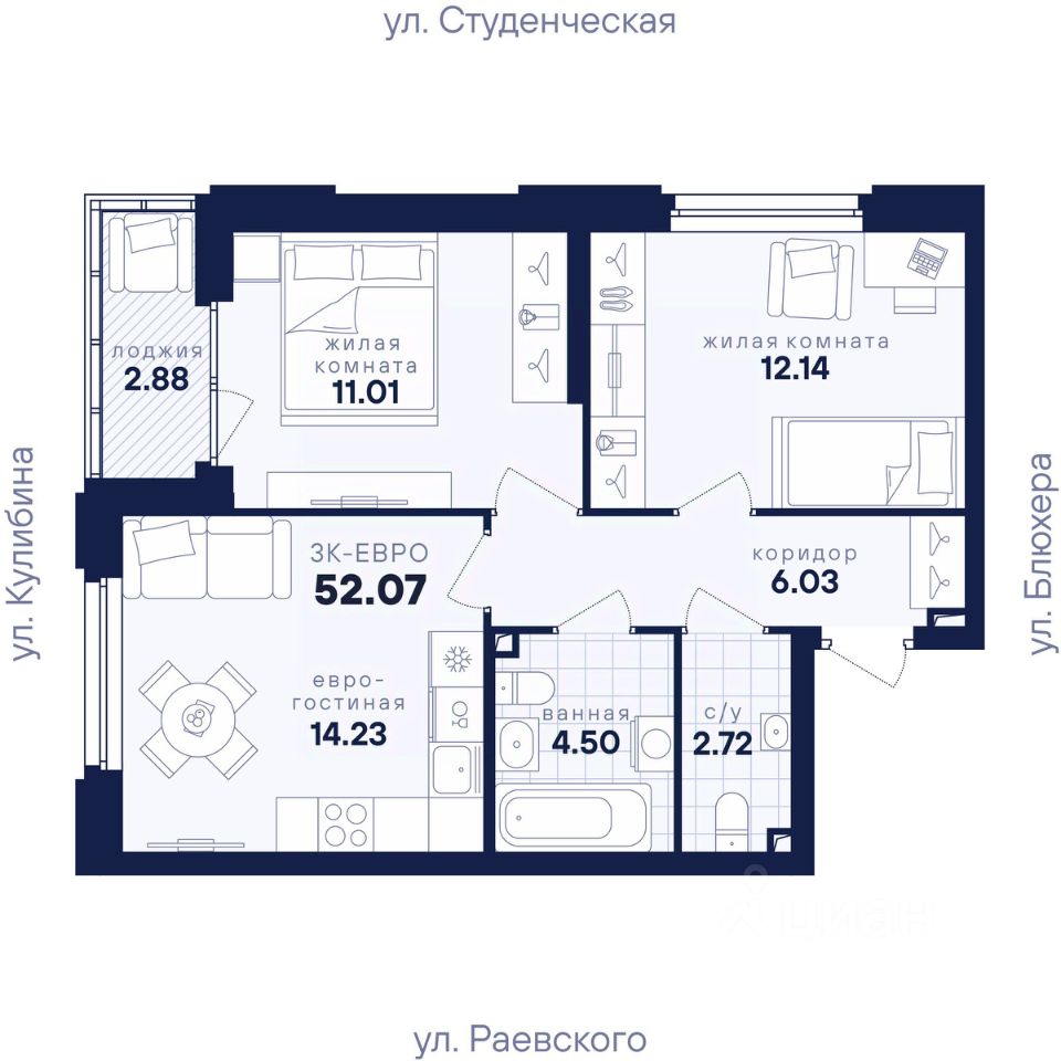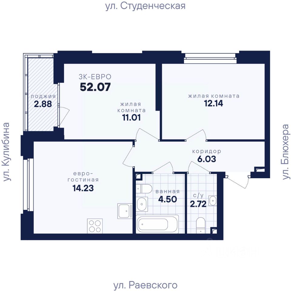 Общая площадь52,07 м2