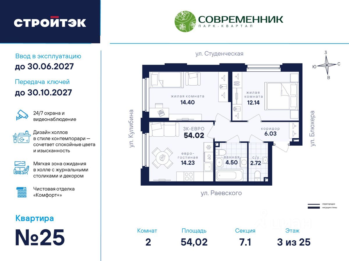 Время жить счастливо Современник — знаковый парк-квартал в интеллигентном районе Втузгородок, откуда недалеко до центра, а вблизи ведущие вузы и театры. Квартал состоит из 8 очередей строительства. Шесть очередей уже сданы и заселены, седьмая строится. В продаже квартиры от застройщика: 1 этап строящейся 7-й очереди. Объединяет квартал большой внутренний парк площадью в гектар — богатый прогулочными маршрутами, тенистыми деревьями, пространствами для отдыха, спорта и детских игр. С внешней стороны, у домов седьмой очереди, появится гостевой центр. Проект создавали в KCAP Architects and Planners, архитектурном бюро из Нидерландов, чьи работы украшают ландшафты Гамбурга, Роттердама, Антверпена и других городов Европы. Современные технологии, продуманное пространство и трендовый облик зданий создают размеренную и счастливую атмосферу для жизни здесь. Достойное окружение До проспекта Ленина на машине вы доберётесь за 10 минут, а с другой стороны, неподалёку — Шарташский лесопарк с озером Шарташ, которому около миллиона лет. Здесь для вас пляжи, лодочные станции, тропы для бега, спортивные площадки и кафе. В квартале уже работают супермаркеты, пекарни, салон красоты и не только. Ближние школы, гимназии и университеты помогут расправить крылья новым поколениям, а детские сады станут заботливой средой в начале пути. Кстати, на территории квартала спроектирован муниципальный детский сад на 200 мест. Выходите во двор Гуляйте по зелёным аллеям или устройтесь с книгой в гамаке. Займитесь воркаутом, футболом, баскетболом или пинг-понгом. Проводите семейные праздники под крытым амфитеатром или отправьте детей весело играть на насыщенный плейхаб. Мы всё предусмотрели. На закрытой территории без машин и посторонних спокойно и безопасно. Видеонаблюдение и освещение добавляют ещё больше уверенности. Впечатляющая доминанта у домов 7 очереди — новый гостевой центр: камерное пространство под навесом-перголой с озеленением и скамейками, чтобы встречать друзей или просто коротать вечер. Ваша зона комфорта Стильное лобби Современника мы выполним в эстетике contemporary: минимализм, сочетание дерева со штукатуркой и тёмным металлом, зеркала, витражи. Обстановка из мягкой мебели, растений и книг. Двери из холла выходят на обе стороны. Внутри — специальная комната для колясок и самокатов. На минус первом этаже подземный паркинг с 201 машино-местом, куда легко попасть на лифте прямо с вашего этажа. Здесь же можно приобрести одну из 67 кладовых, чтобы хранить сезонный инвентарь и крупную технику. СТРОЙТЭК возводит 7 очередь в 3 этапа. Дом с привилегиями Первый этап — секция 7.1, отдельная башня в 25 этажей. Здесь 246 квартир в 19 уникальных планировках от студий до 3-комнатных, в классических и евро-вариантах. Просторные кухни-гостиные, гардеробные и окна на 2 стороны — лишь часть их плюсов. В Современнике улучшенный стандарт отделки ''Комфорт +''. Помимо привычных комфортных сантехники и электрики, в него входят оконные стёкла Energy Light, которые помогают сохранять комфорт