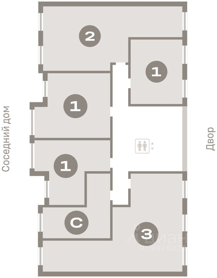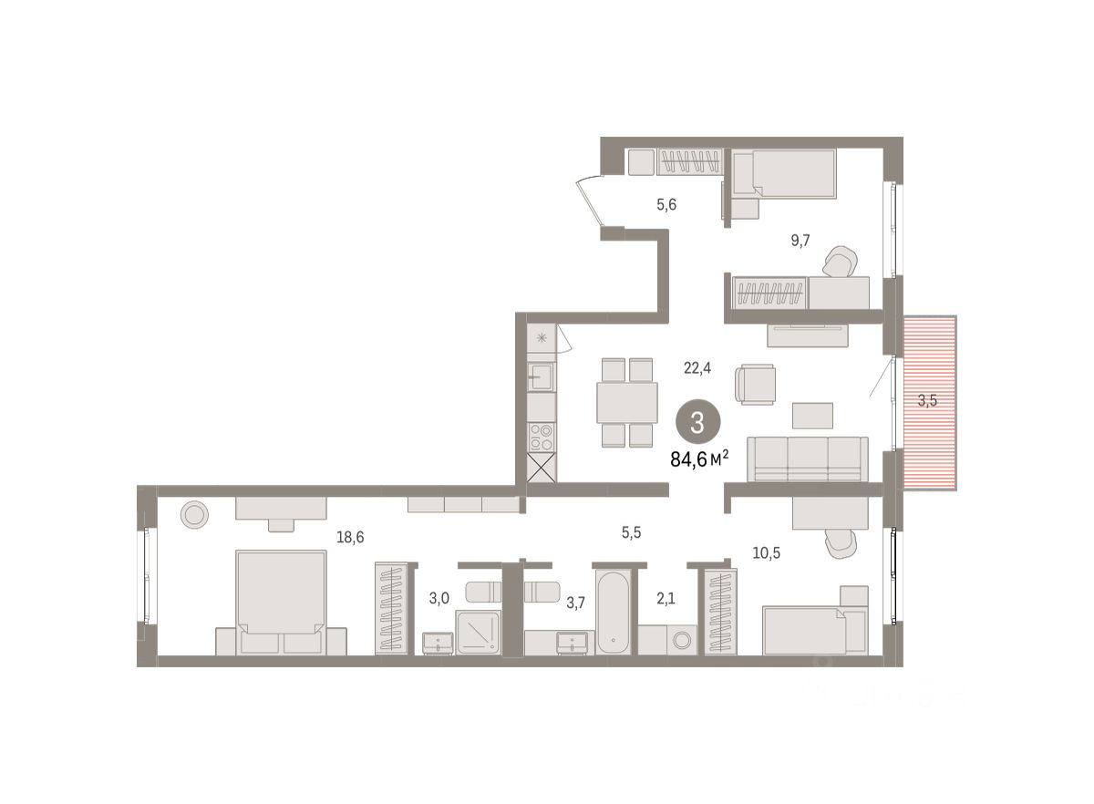 Квартира с кухней-гостиной и тремя спальнями в Южных кварталах. Особенности планировки: окна на две стороны, вид во двор, разнесённые спальни, предчистовая отделка, мастер-спальня, постирочная, балкон. квартиры в нашей базе: ЮКВ08-Ж8.3.1.