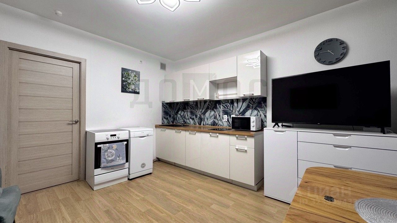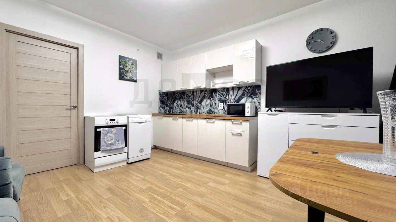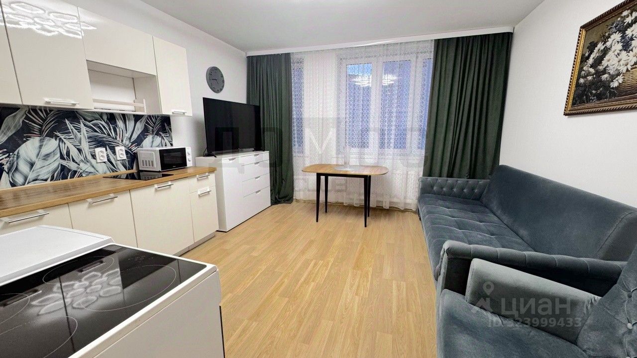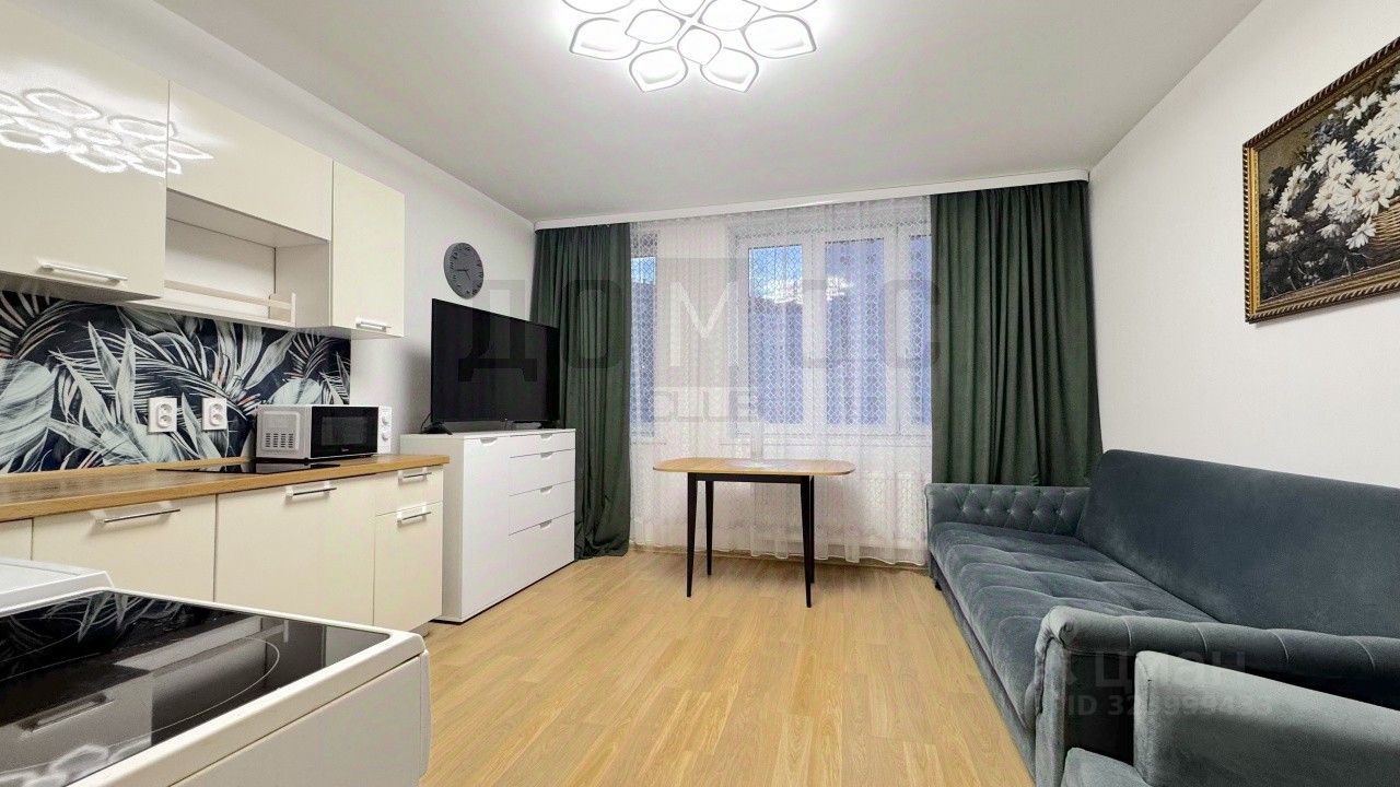 Просторная студия правильной формы , что позволяет разместить всю необходимую мебель без ощущения тесноты. В квартире остается кухонный гарнитур и шкаф-купе в коридоре.