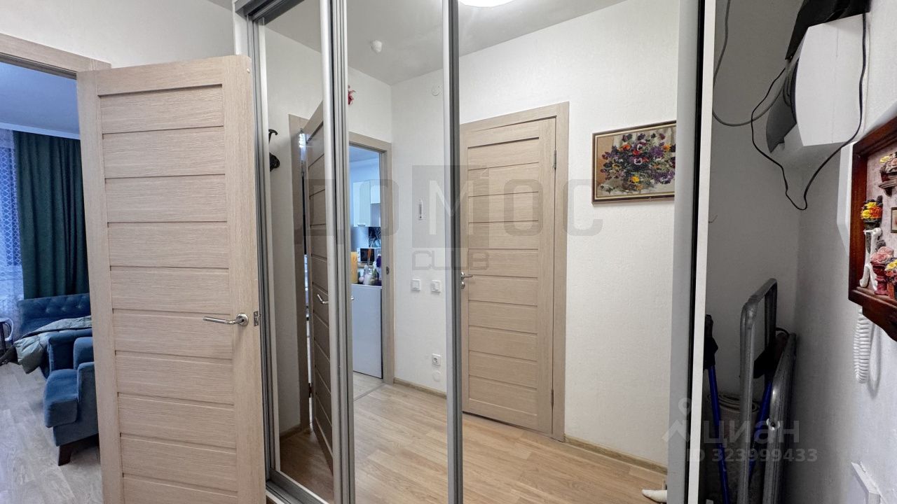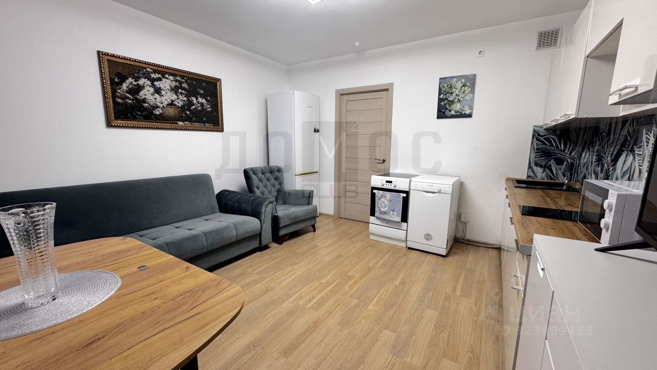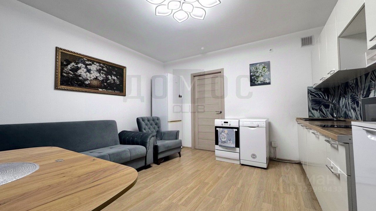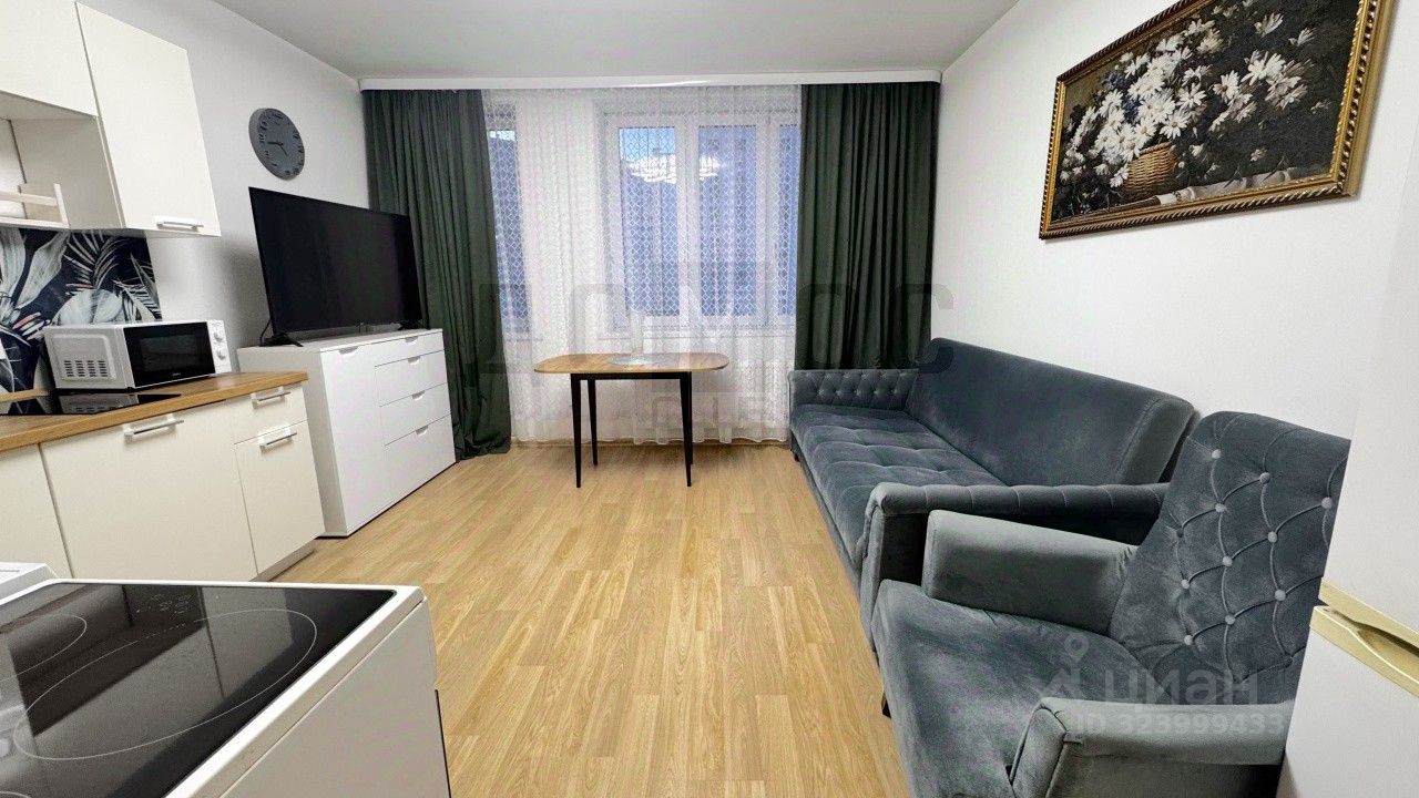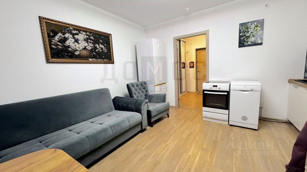 Просторная студия правильной формы , что позволяет разместить всю необходимую мебель без ощущения тесноты. В квартире остается кухонный гарнитур и шкаф-купе в коридоре.