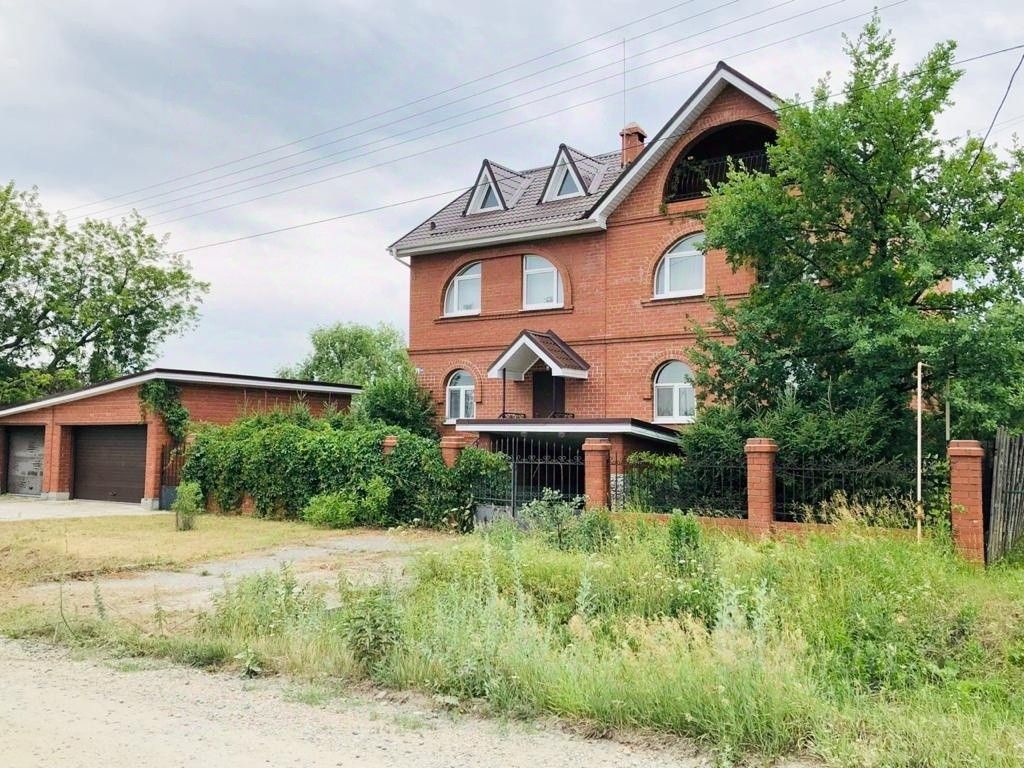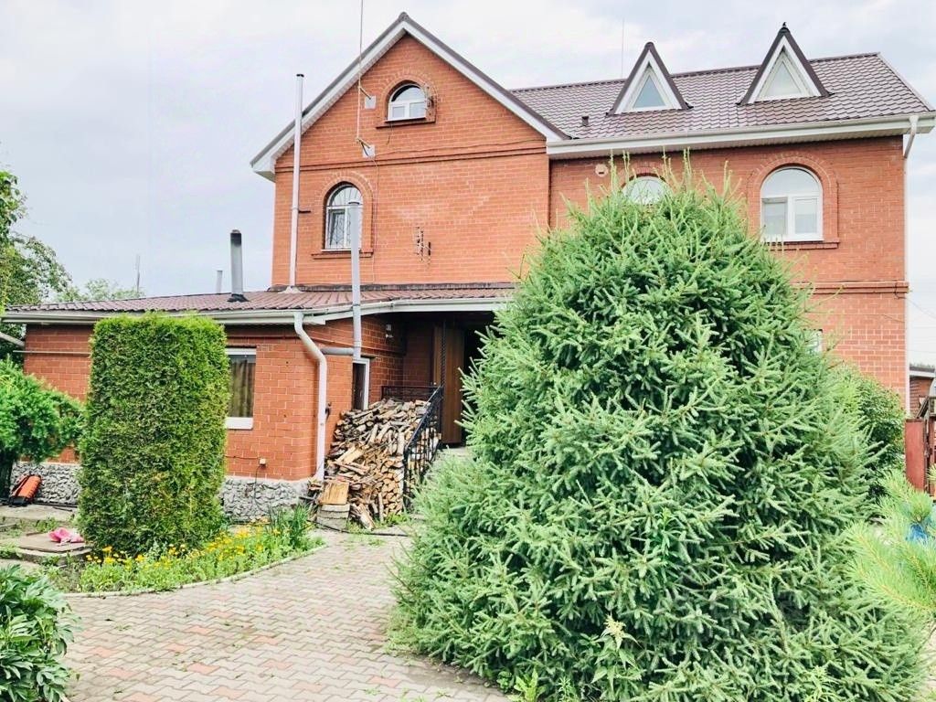 Коттедж построен из пеноблоков и облицован красным кирпичом.