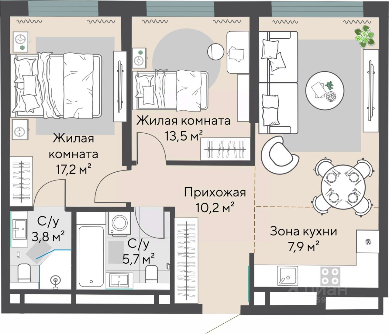 Продаётся 2-комнатная квартира в строящемся доме (Секции 2.3-2.4), срок сдачи: I-кв. 2028, общей площадью 76.6 кв.м., на 16 этаже.