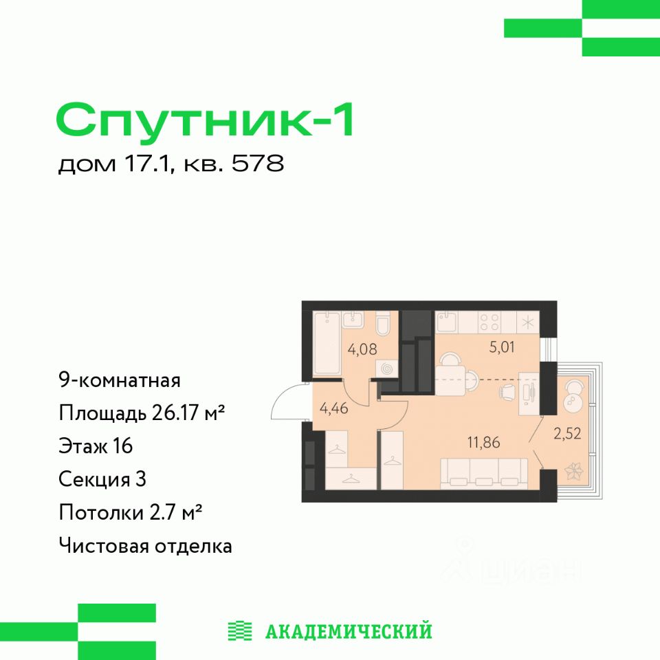 Продается студия площадью 26.17 кв.м. от девелопера ''Академический'' в жилом квартале ''Спутник 1''. Срок сдачи дома в 2027 году.