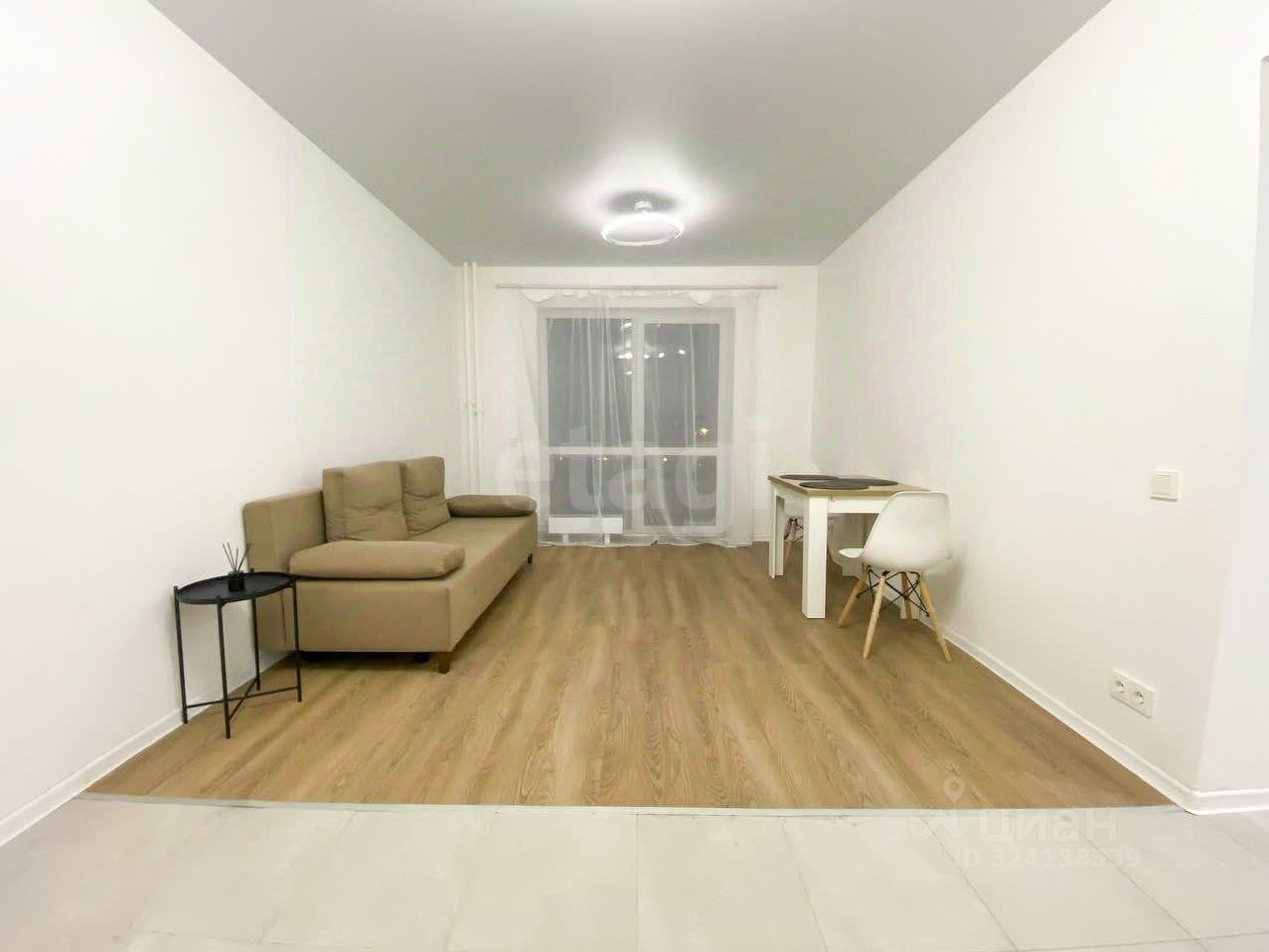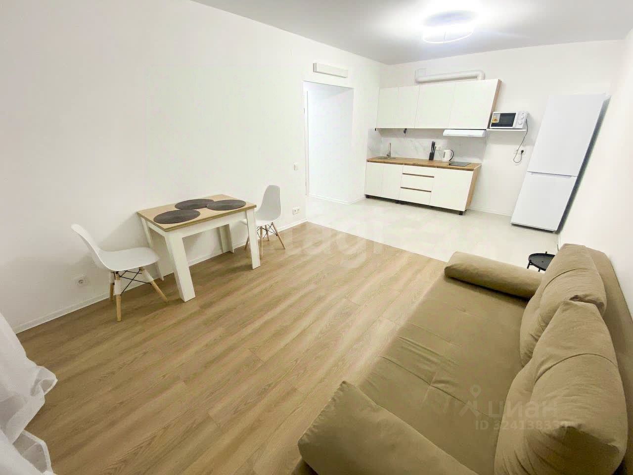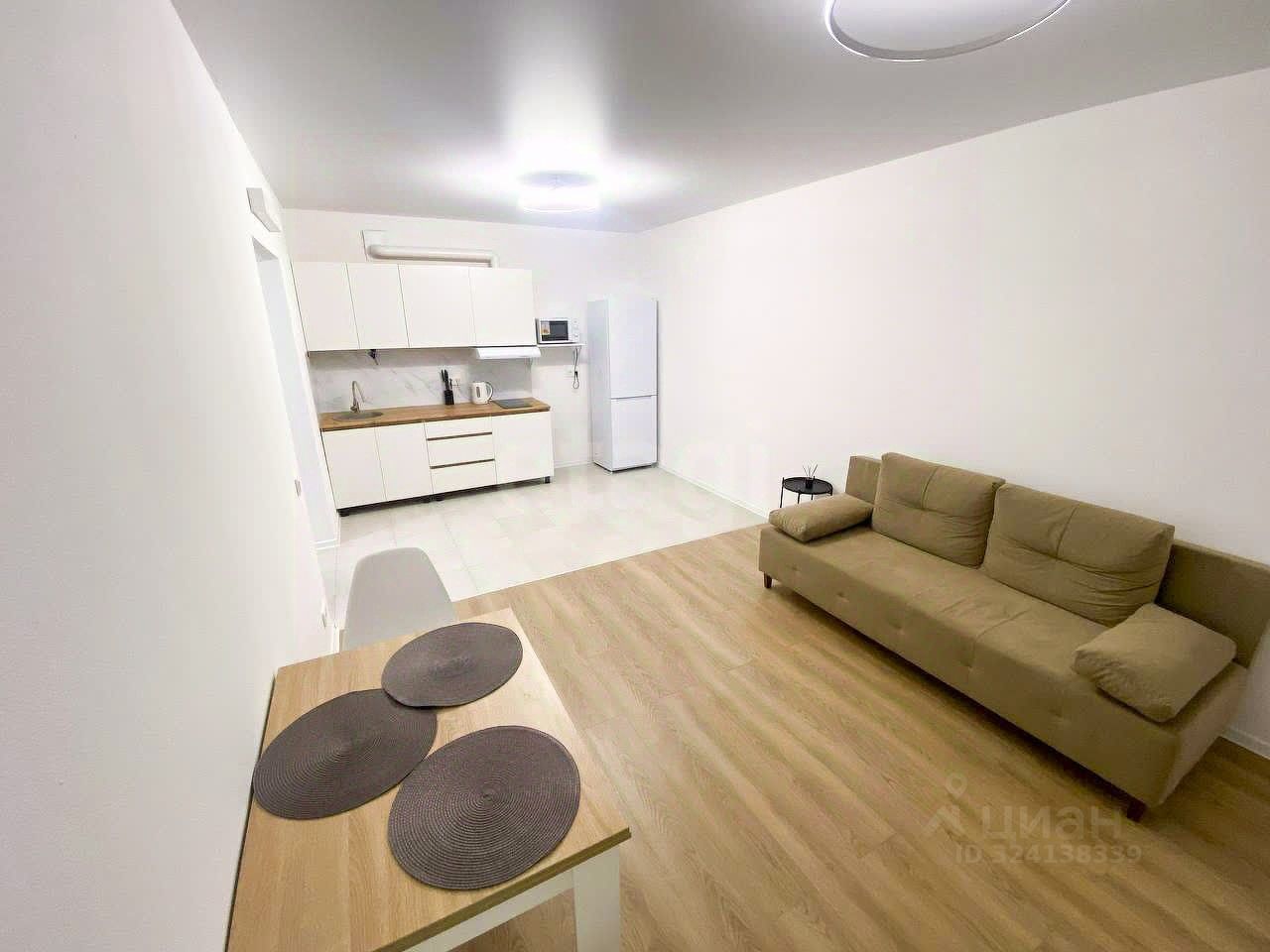 В квартире современный ремонт от застройщика. Установлен кухонный гарнитур, имеется всё для комфортного проживания - техника, кровать, диван, стол и стулья, а так же шкаф.
