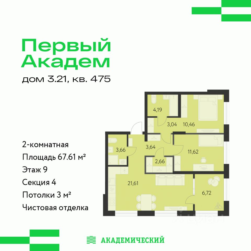Продается 2-комнатная квартира площадью 67.61 кв.м. от девелопера ''Академический'' в жилом квартале ''Первый Академ''. Срок сдачи дома в 2028 году. Выгоды и скидка напрямую от застройщика.