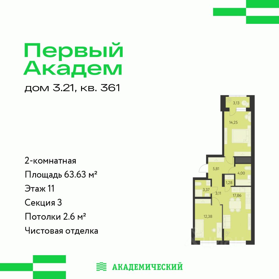 Продается 2-комнатная квартира площадью 63.63 кв.м. от девелопера ''Академический'' в жилом квартале ''Первый Академ''. Срок сдачи дома в 2028 году. Выгоды и скидка напрямую от застройщика.