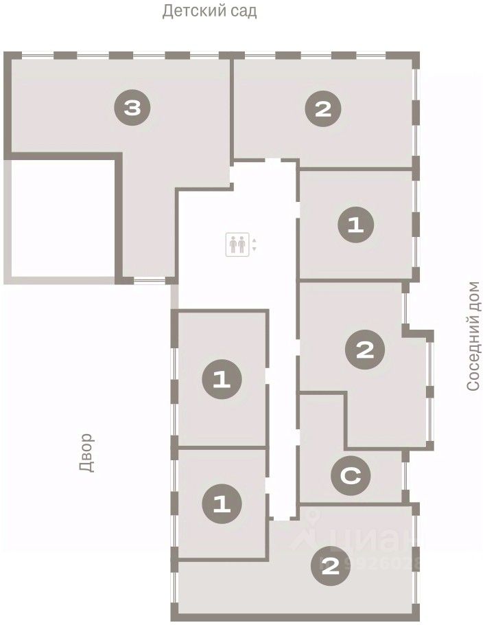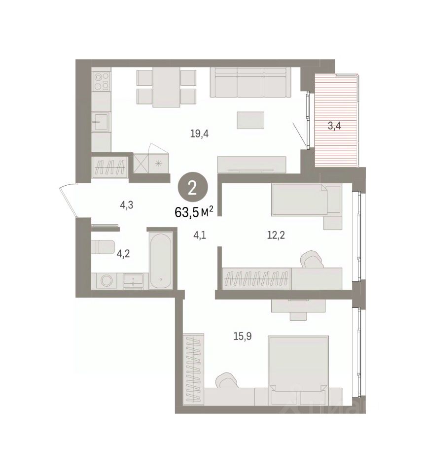 Квартира с кухней-гостиной и двумя спальнями в Южных кварталах. Особенности планировки: предчистовая отделка, балкон. квартиры в нашей базе: ЮКВ08-Ж3.3.4.