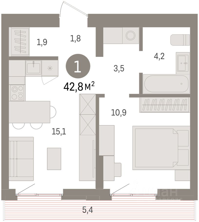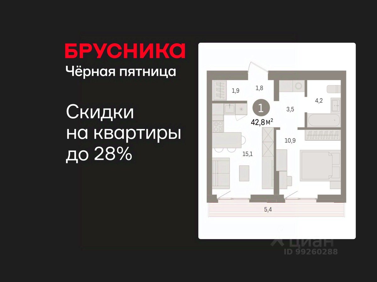 Просторная однокомнатная квартира с предчистовой отделкой в ЖК ''Квартал Траектория'' на 5 этаже. Общая площадь: 42.8 кв.м. Высота потолков 2.82 м.