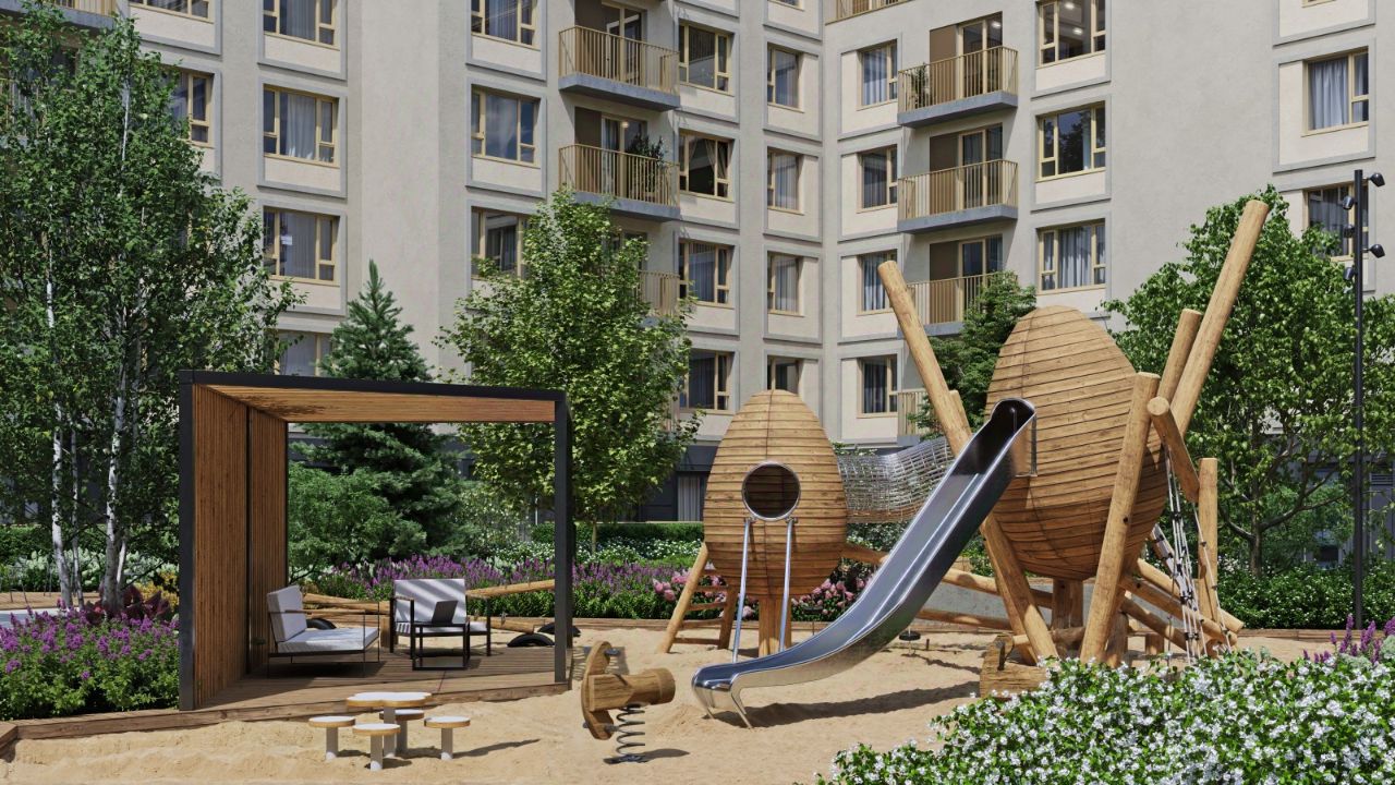 Каждый двор в квартале ''Траектория'' — продолжение квартиры, только под открытым небом. Здесь можно прогуляться босиком по траве, устроить утреннюю йогу, почитать книгу в гамаке или отправить детей поиграть, не переживая за их безопасность.
