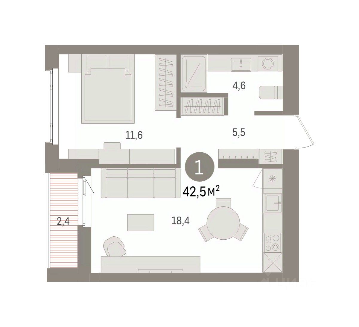 Квартира с кухней-гостиной и одной спальней в квартале ''Траектория''. Особенности планировки: лоджия, предчистовая отделка. квартиры в нашей базе: МНВ01-Ж9.8.4.