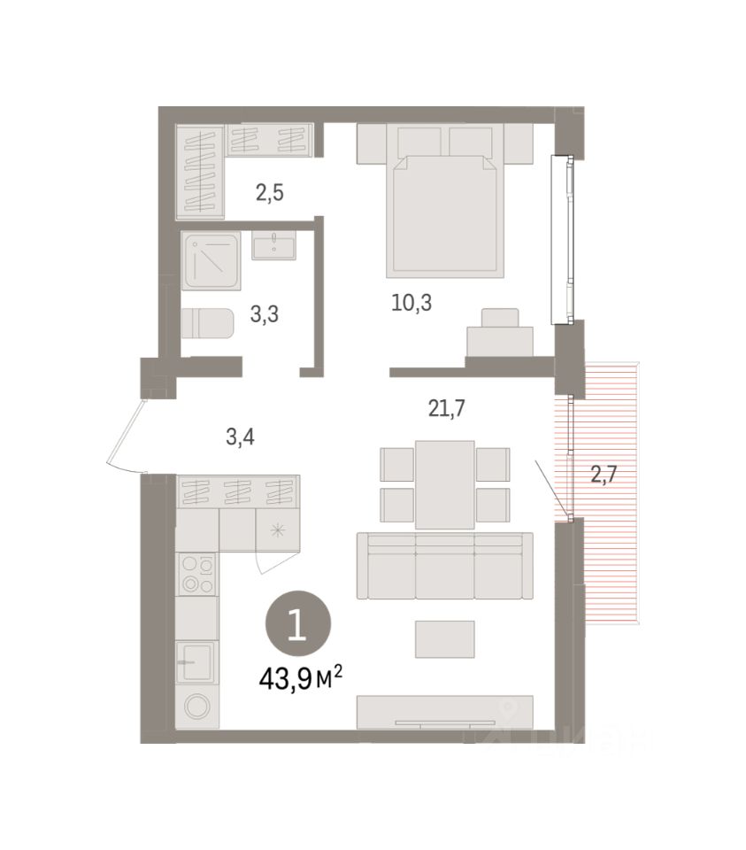Квартира с кухней-гостиной и одной спальней в квартале ''Траектория''. Особенности планировки: гардеробная, вид во двор, предчистовая отделка, балкон. квартиры в нашей базе: МНВ01-Ж5.5.9.