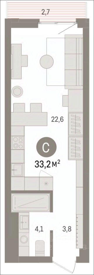 Однокомнатная студия с предчистовой отделкой в ЖК ''Квартал Траектория'' на 12 этаже. Общая площадь: 33.2 кв.м. Высота потолков 2.82 м.