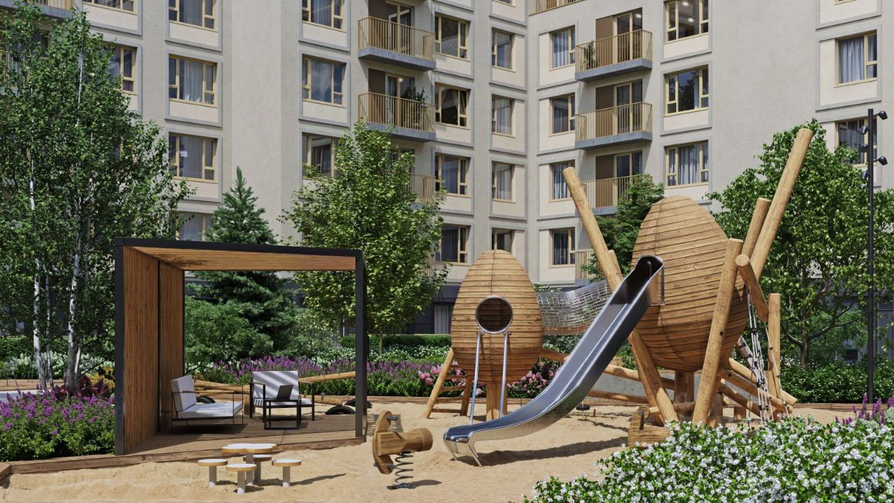 Каждый двор в квартале ''Траектория'' — продолжение квартиры, только под открытым небом. Здесь можно прогуляться босиком по траве, устроить утреннюю йогу, почитать книгу в гамаке или отправить детей поиграть, не переживая за их безопасность.