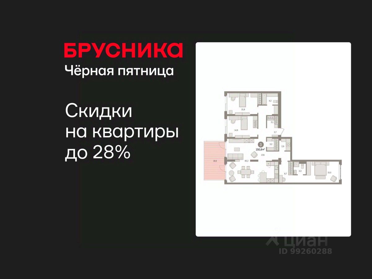 Трехкомнатная квартира от застройщика с предчистовой отделкой в ЖК ''Квартал Траектория'' на 2 этаже. Общая площадь: 150.8 кв.м. Высота потолков 2.82 м.