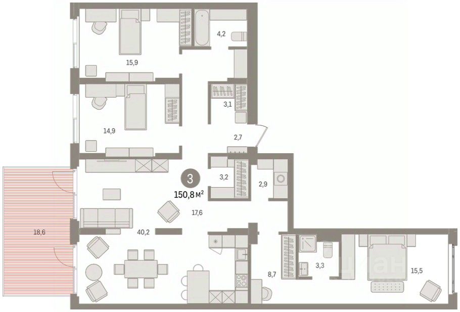 Квартира с кухней-гостиной и тремя спальнями в квартале ''Траектория''. Особенности планировки: окна на две стороны, гардеробная, окна в пол, вид во двор, панорамное остекление, разнесённые спальни, предчистовая отделка, мастер-спальня, терраса, постирочная. квартиры в нашей базе: МНВ01-Ж12.2.6.