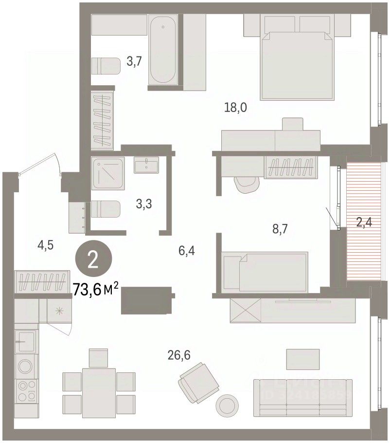 Квартира с кухней-гостиной и тремя спальнями в квартале ''Траектория''. Особенности планировки: лоджия, разнесённые спальни, предчистовая отделка, мастер-спальня. квартиры в нашей базе: МНВ01-Ж12.8.5.