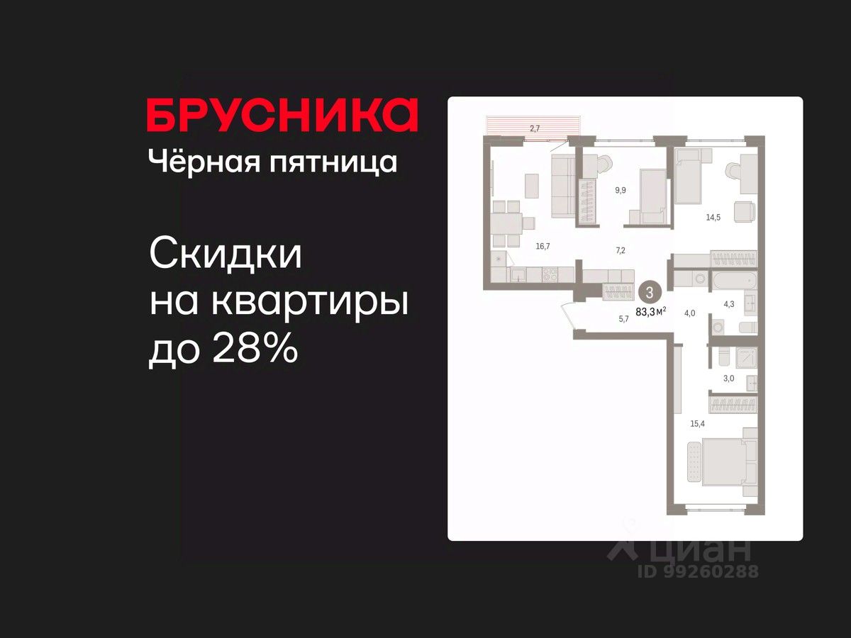 Продается 3-комн. квартира с предчистовой отделкой в ЖК ''Квартал Траектория'' на 4 этаже. Общая площадь: 83.3 кв.м., жилая: 39.8 кв.м., площадь просторной кухни-столовой: 16.7 кв.м. Квартира - распашонка, без проходных комнат, окна выходят на paзные стороны дома. В квартире один балкон, два совмещенных санузла. Высота потолков 2.82 м.