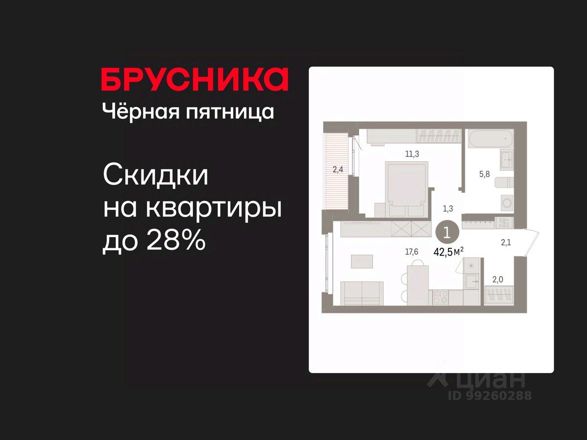 Продается 1-комн. квартира от застройщика с предчистовой отделкой в ЖК ''Квартал Траектория'' на 8 этаже. Общая площадь: 42.5 кв.м., жилая: 11.3 кв.м., площадь просторной кухни-столовой: 17.6 кв.м. Все окна выходят на одну сторону. В квартире одна лоджия, один совмещенный санузел. Высота потолков 2.82 м.