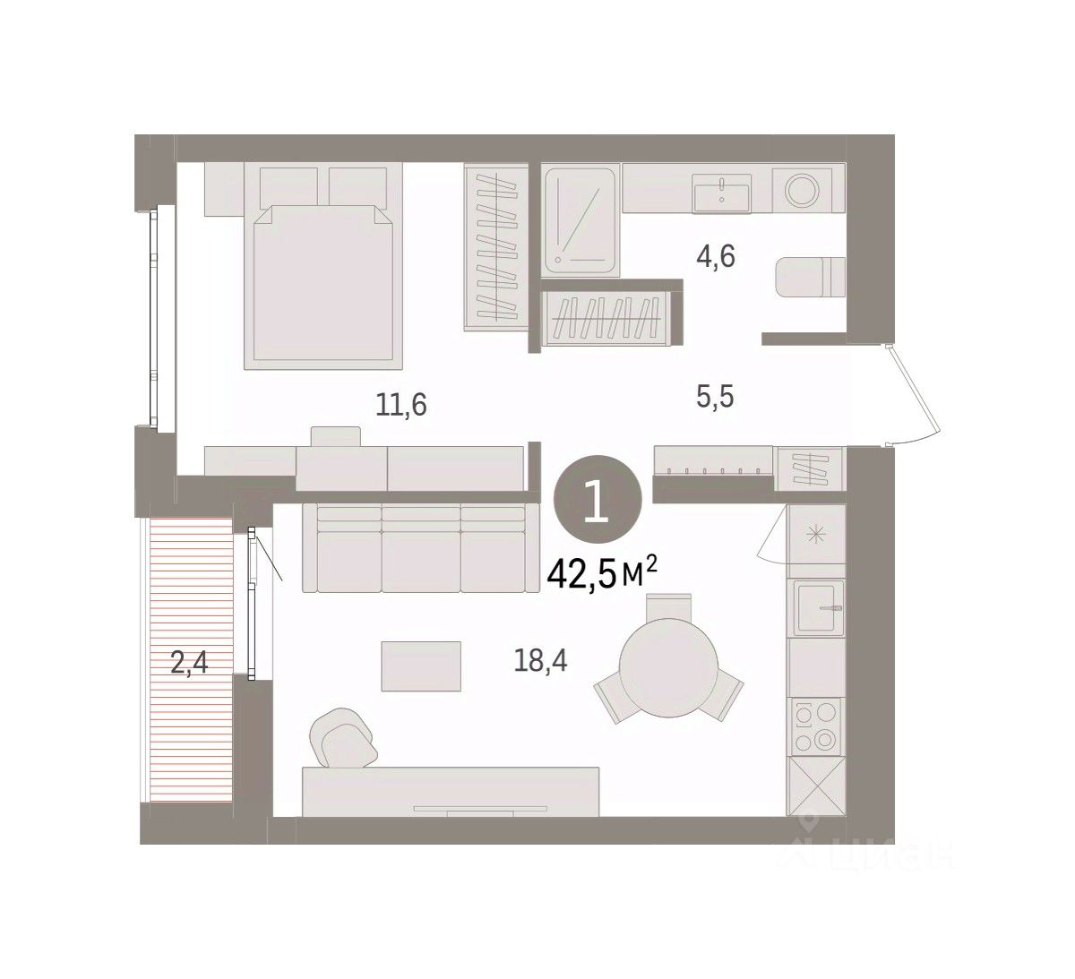 Общая площадь42,5 м2