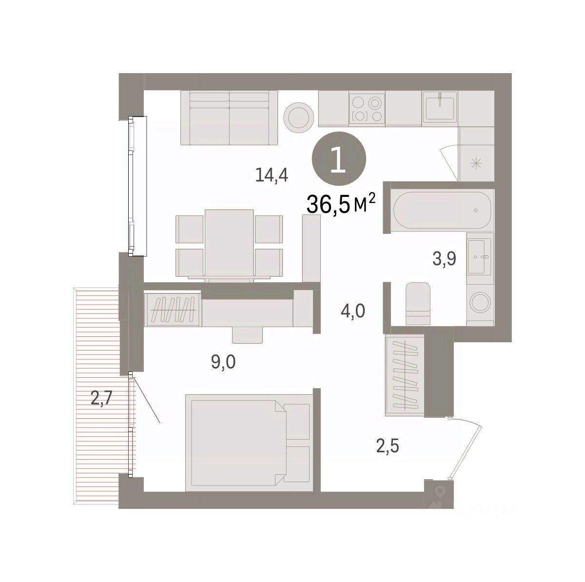 Квартира с кухней-гостиной и одной спальней в квартале ''Траектория''. Особенности планировки: стартовая цена, предчистовая отделка, балкон. квартиры в нашей базе: МНВ01-Ж1.7.1.