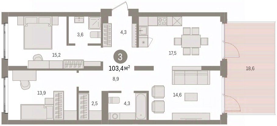 Квартира с кухней-гостиной и тремя спальнями в квартале ''Траектория''. Особенности планировки: окна на две стороны, гардеробная, вид во двор, разнесённые спальни, предчистовая отделка, мастер-спальня, терраса. квартиры в нашей базе: МНВ01-Ж7.2.1.