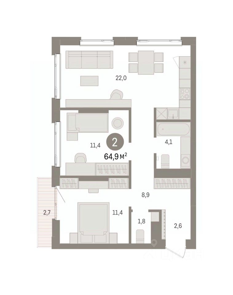 Квартира с кухней-гостиной и двумя спальнями в квартале ''Траектория''. Особенности планировки: второй санузел, разнесённые спальни, предчистовая отделка, балкон. квартиры в нашей базе: МНВ01-Ж1.11.8.