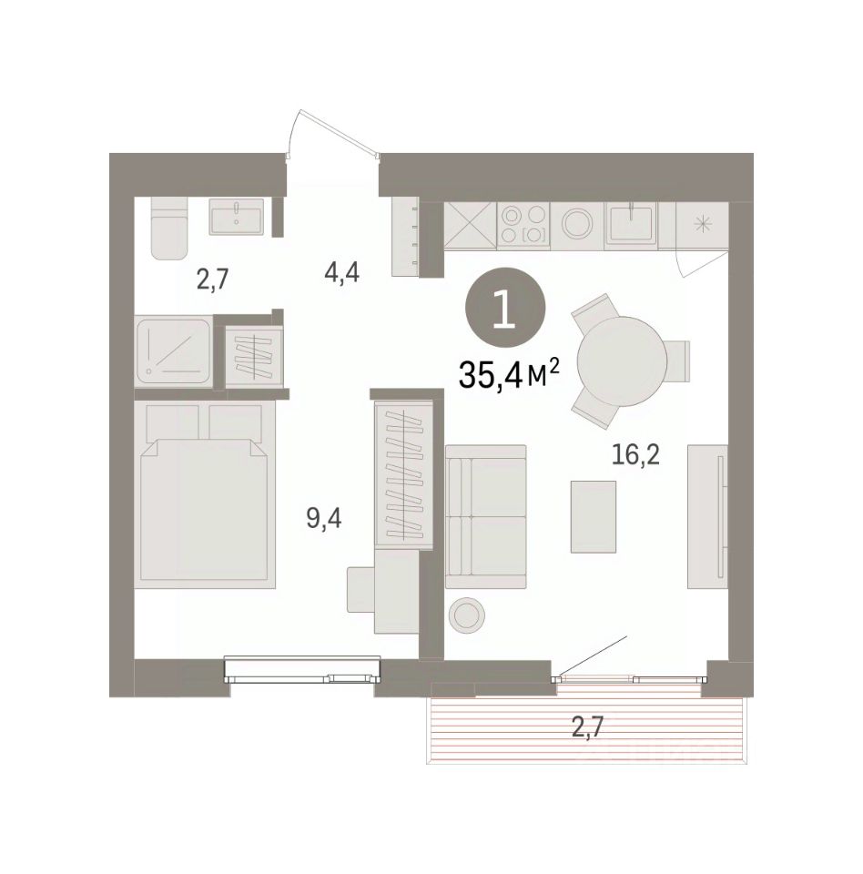 Квартира с кухней-гостиной и одной спальней в квартале ''Траектория''. Особенности планировки: вид во двор, предчистовая отделка, балкон. квартиры в нашей базе: МНВ01-Ж7.5.8.