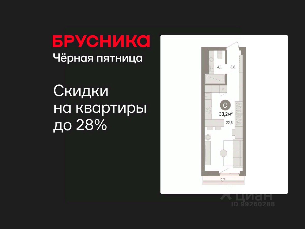 1-комн. студия от застройщика с предчистовой отделкой в ЖК ''Квартал Траектория'' на 11 этаже. Общая площадь: 33.2 кв.м. Высота потолков 2.82 м.
