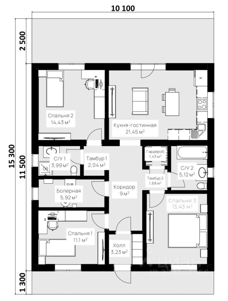 Планировка: - Просторная кухня-гостинная - Три спальни - Два Санузла - Гардероб